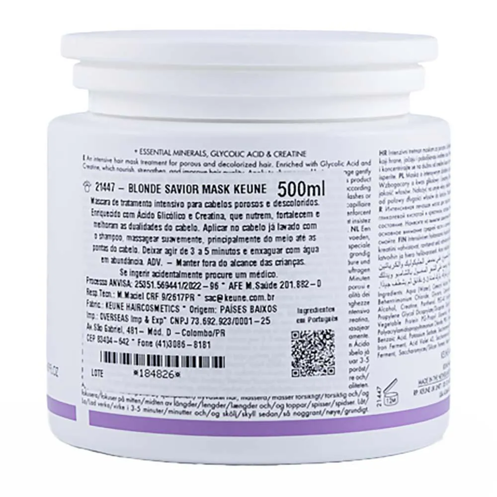 A Máscara Blonde Savior faz parte da linha de tratamento Blonde Savior, desenvolvida especialmente para cabelos sensibilizados, danificados e descoloridos. Assim como nos demais produtos da linha, a máscara conta com Ácido Glicólico e Creatina como ingredientes principais. Enquanto o ácido glicólico atrai água para o fio, mantendo-o hidratado, a Creatina fortalece as ligações dentro do fio de cabelo, recuperando sua saúde e força.