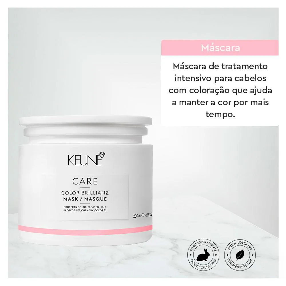 Cabelos com coloração precisam de proteção e nutrição extra. Para recuperar intensivamente os fios porosos e prevenir o desbotamento dos cabelos com coloração, Keune desenvolveu a Máscara Care Color Brillianz, com a exclusiva Tecnologia Color Sealing Complex, que trata a fibra capilar danificada e desgastada resultado de repetidas colorações. Cria uma barreira protetora ao sobre os fios, evitando que a cor desbote e mantendo-os protegidos contra os danos dos raios UVA/UVB. Cabelos com cores mais vibrantes, macios e maleáveis. Mantenha a cor sempre viva!