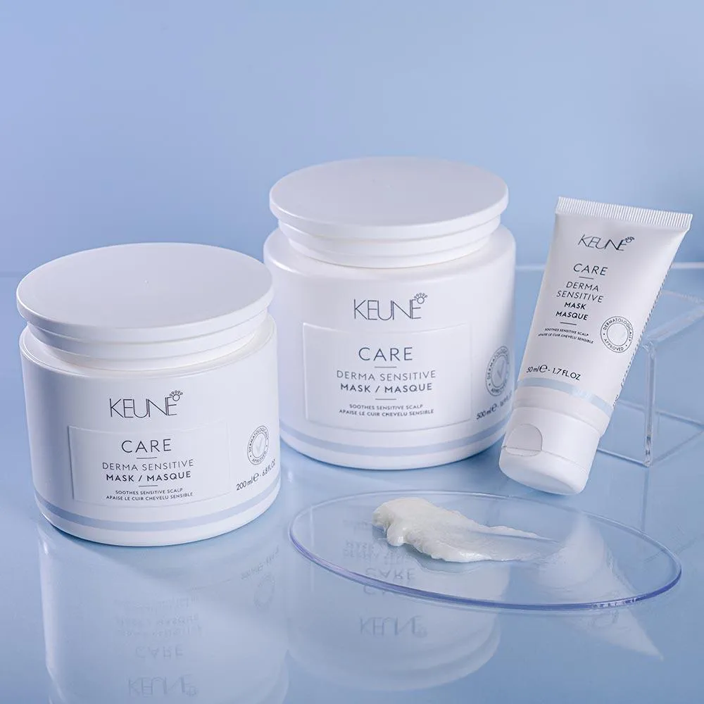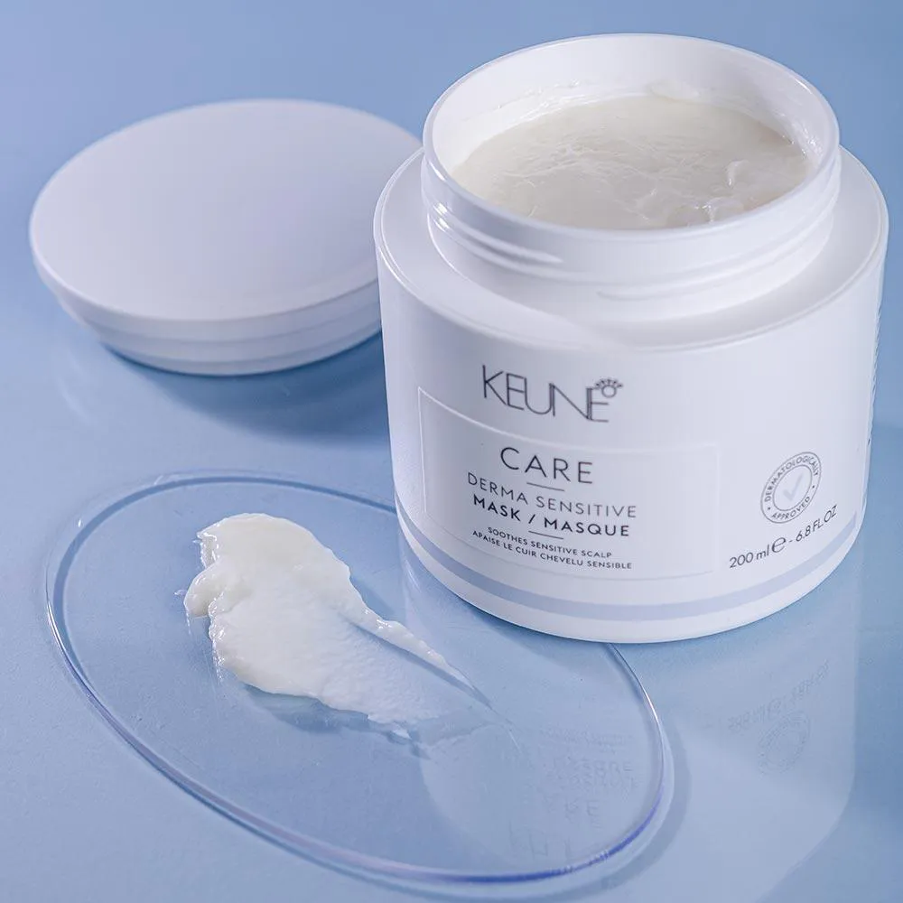 A Keune Care Derma Sensitive Mask é ideal para um cuidado intensivo no couro cabeludo e garante fios leves e brilhantes.