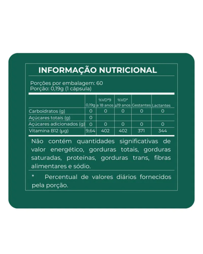 Este suplemento é ideal para pessoas com dietas restritivas, como vegetarianos e veganos, idosos ou indivíduos com dificuldade na absorção de B12 por via alimentar. Com 60 cápsulas por embalagem, o produto oferece praticidade e rendimento para dois meses de uso contínuo (1 cápsula ao dia).