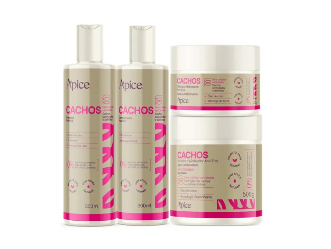 O Kit Apse inclui: shampoo 300ml, condicionador 300ml, Máscara 300g e Ativador 500g da linha Cachos NOVA FRAGÂNCIA Apse Vegano.