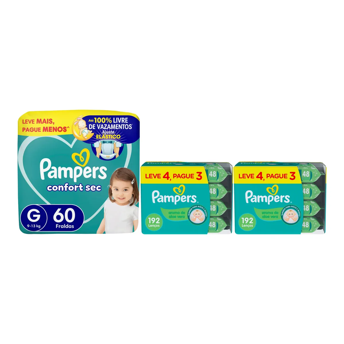 Kit 1 Fralda Pampers Confort Sec G 60 unidades + 2 Kit Lenço Umedecido Pampers Aroma de Aloe Vera 48 unidades 4 pacotes