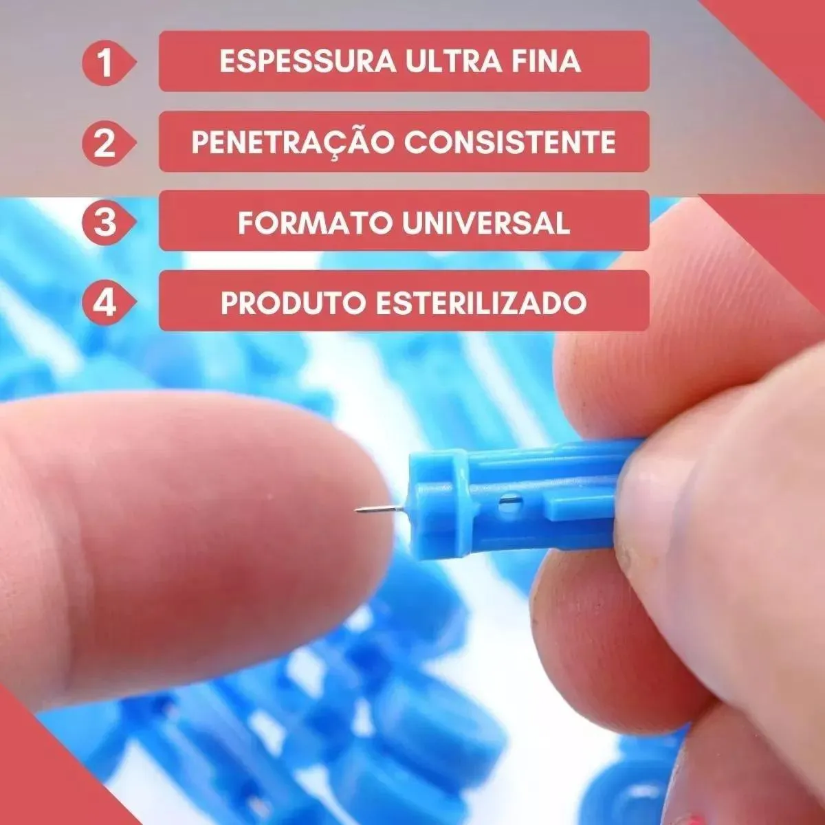 Acompanham um lacre de proteção individual. Com apenas um clique, o produto perfura a pele com mínimo desconforto, devido às suas profundidades ajustáveis.