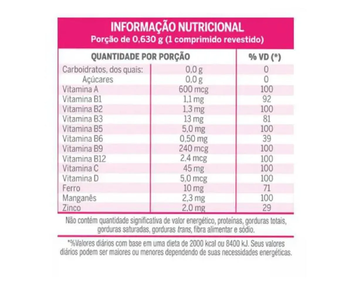 INGREDIENTES: Ácido ascórbico, sulfato ferroso, nicotinamida, sulfato de zinco, sulfato de manganês, d-pantotenato de cálcio, acetato de vitamina a, cloridrato de tiamina, riboflavina, cloridrato de piridoxina, ácido fólico, vitamina D3, cianocobalamina, antiumectante dióxido de silício, estabilizantes celulose microcristalina e croscarmelose sódica, revestimento (agente de corpo etilcelulose, estabilizante hidroxipropilmetilcelulose, umectante triacetina, corante inorgânico dióxido de titânio e corantes vermelho 40, vermelho eritrosina e carmim).