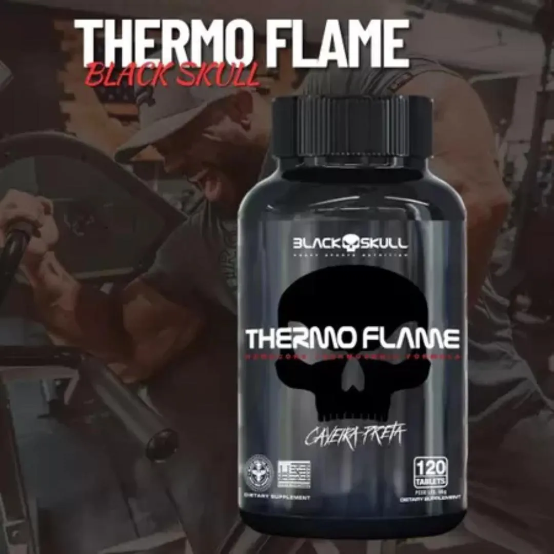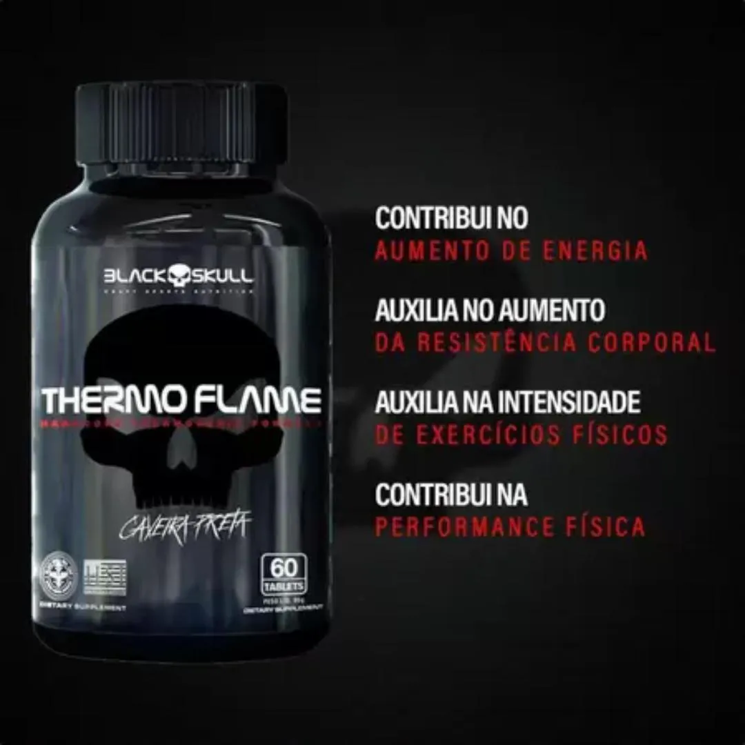 THERMO FLAME: Um potente termogênico para ajudar naquele shape rasgado e na repetição a mais que você precisa no treino caveira. Energia, Força e Foco são alguns dos benefícios da cafeína pura, importante parceiro de treinos sérios e com resultados reais.