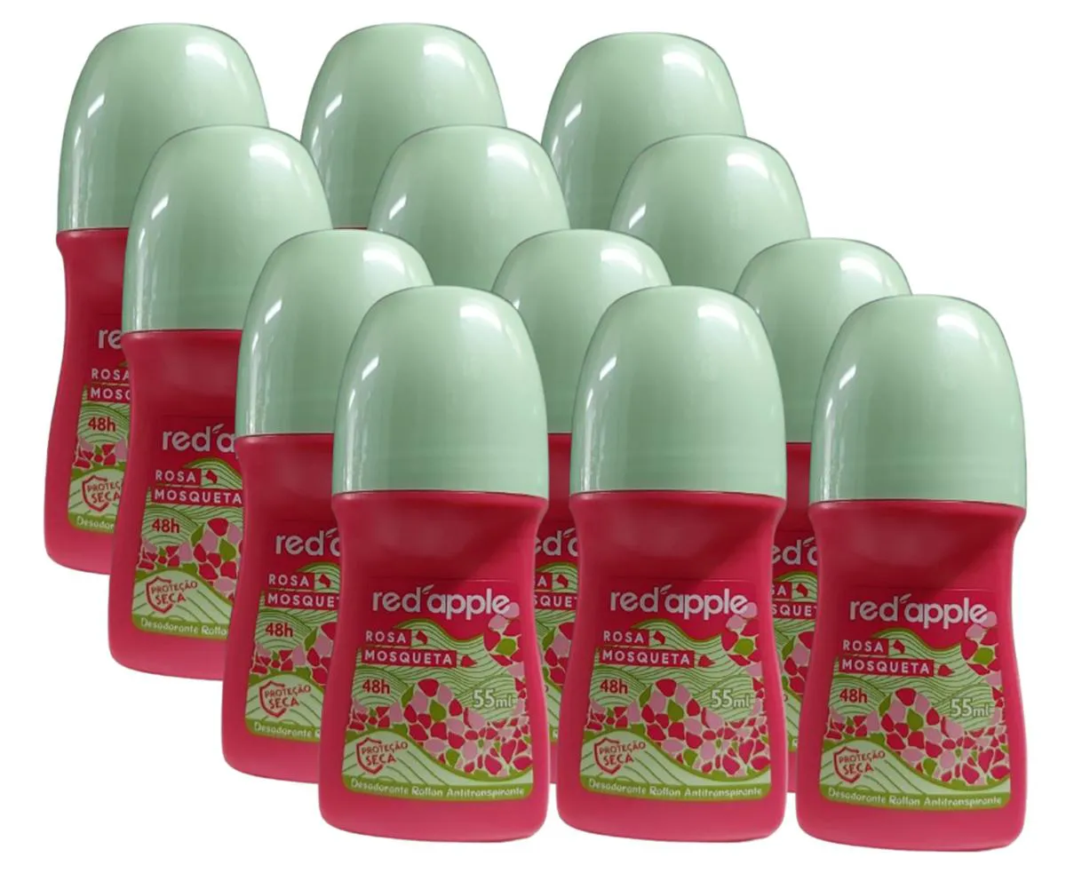 Kit 12 Desodorante Red Apple Roll On Rosa Mosqueta 55ml