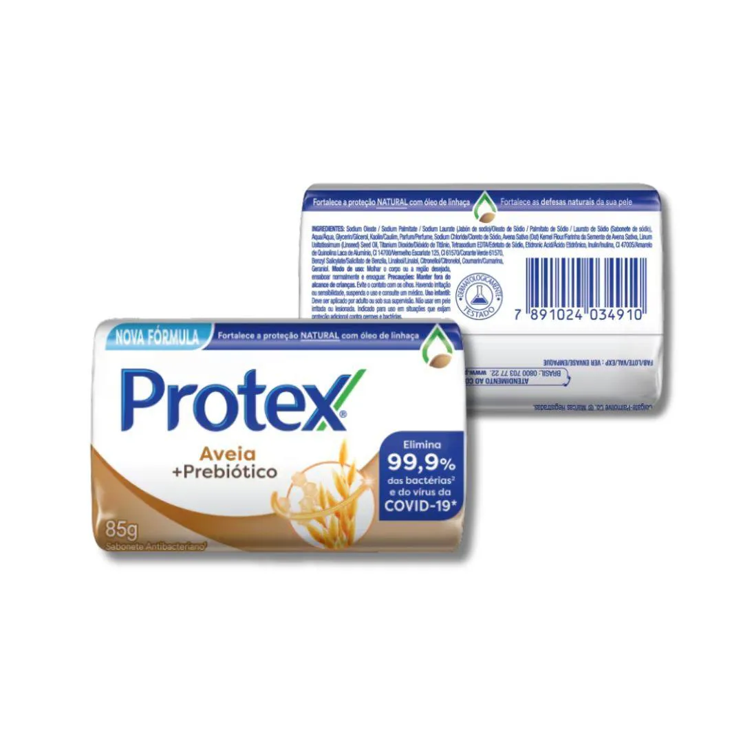 Kit com 12 sabonetes Protex Aveia + Prebiótico 85g A Protex reinventou os sabonetes antibacterianos, sua fórmula fortalece a proteção natural com óleo de linhaça. Ela é enriquecida com aveia + prebiótico, limpa suavemente e remove as impurezas para a obtenção de uma pele suave, protegida e saudável. Elimina 99,9% das bactérias* e o vírus da COVID-19! Ingredientes ativos: - Oleato de Sódio Palmitato de Sódio Laurato de Sódio (sabonete de sódio), Aqua Áqua, Glicerol, Caulim, Perfume, Farinha da Semente de Avena Sativa, Óleo da Semente de Linum Usitatissimum, Cloreto de Sódio, Dióxido de Titânio, Edetato de Sódio, Ácido Etidrônico, Inulina, CI 47005 Amarelo de Quinolina Laca de Alumínio, CI 14700 Vermelho Escarlate 125, CI 61570 Corante Verde 61570, Salicilato de Benzila, Linalol, Citronelol, Cumarina, Geraniol Como usar? - Molhe o corpo ou a área desejada, ensaboe normalmente e enxague. Precauções: - Mantenha fora do alcance de crianças. Evite contato com os olhos, se isso acontecer, enxague com bastante água. Se você perceber qualquer reação desfavorável, pare de usar e consulte o seu médico. Este produto pode ser irritante se não for usado como informado nas instruções de uso. Marca: Protex Linha: Aveia + Prebiótico Tipo: Sabonete em barra Peso unitário: 85g Quantidade no kit: 12 unidades Ação: Elimina até 99,9% das bactérias Proteção: Até 12 horas Fórmula: Com óleo de linhaça, aveia e prebiótico Indicação: Corpo pH: Balanceado Dermatologicamente testado: Sim Textura: Espuma cremosa