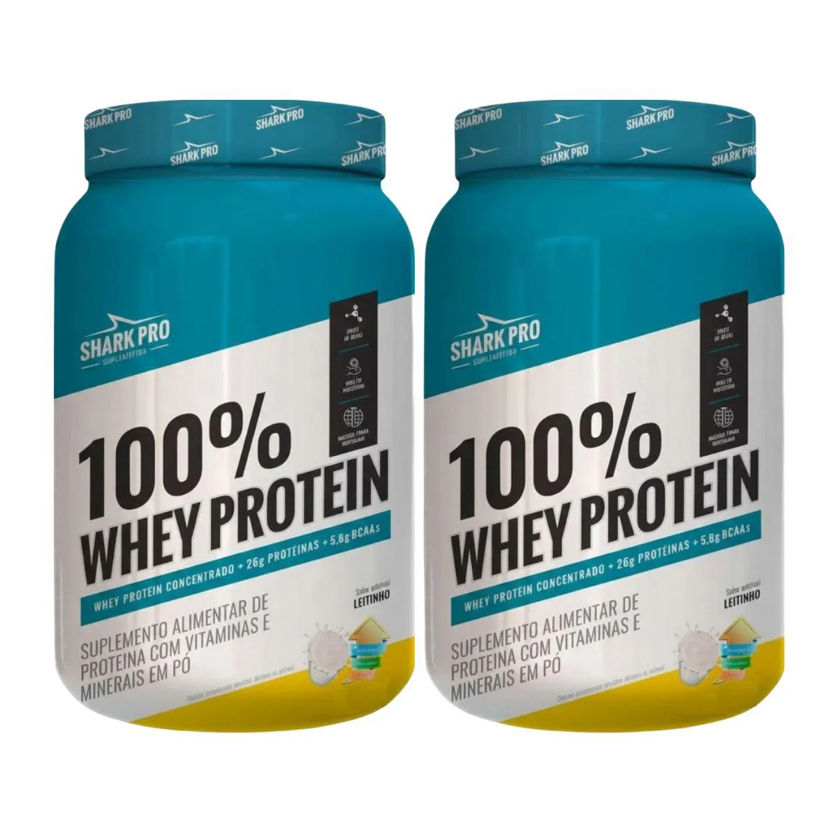 KIT 2 100% WHEY PROTEIN CONCENTRADO SABOR LEITINHO 26G DE PROTEÍNA POTE 900G SHARK PRO