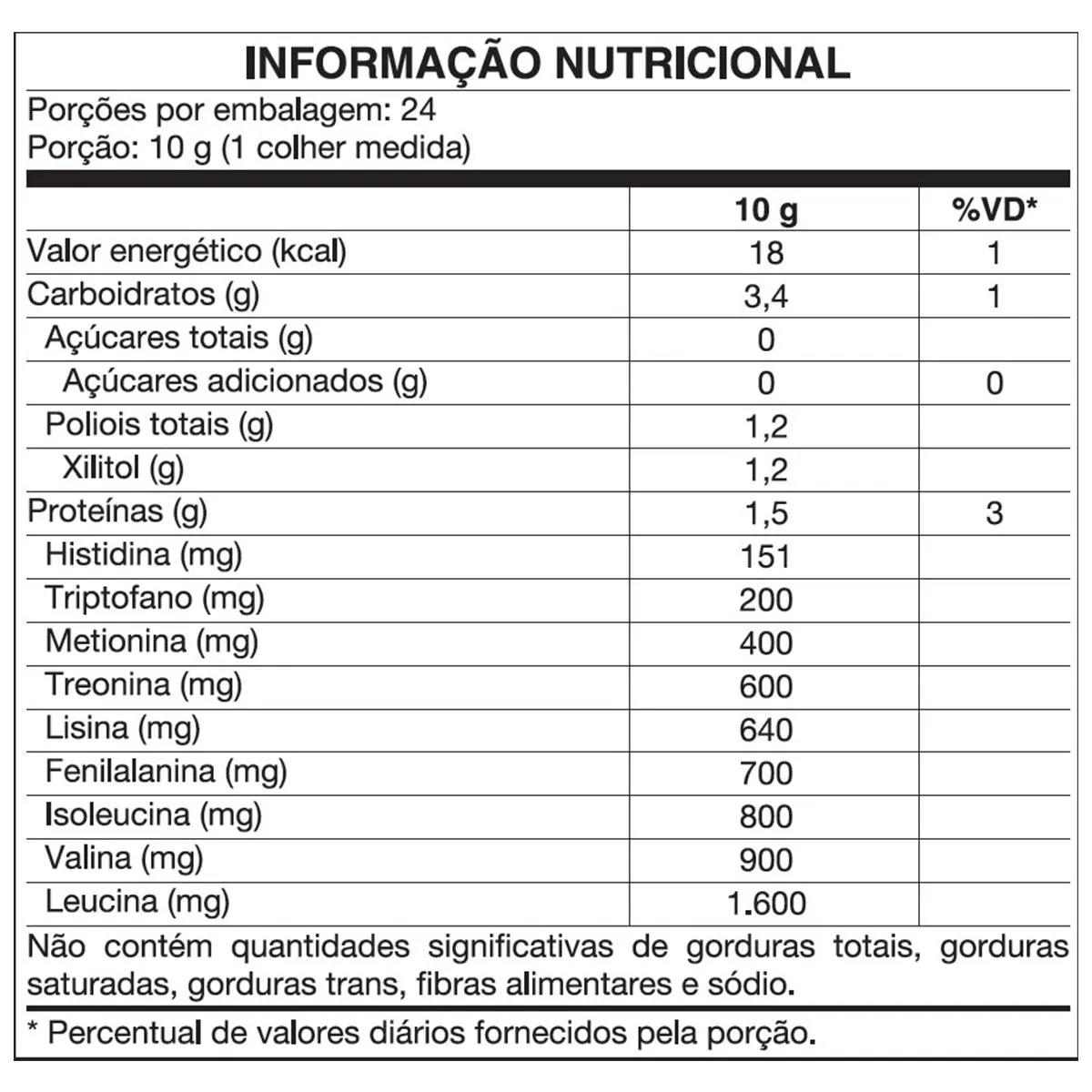- Selo de qualidade VLabor.Recomendação de uso:Suplemento alimentar de uso adulto (a partir de 19 anos de idade): ingerir 10 g (1 colher medida) antes das refeições ou antes e/ou depois das atividades físicas ou seguir a recomendação de um profissional da saúde.Modo de uso:Dissolva 10 g (1 colher medida ou 1 sachê) em aproximadamente 200 ml de água ou na sua bebida favorita e misture até total homogeneização. Beba imediatamente após o preparo. Para facilitar a mistura, de preferência, utilize uma coqueteleira. O produto pronto para o consumo pode apresentar pontos brancos aparentes (característica natural dos ingredientes que compõem o produto).Ingredientes:Sabor Maracujá:Leucina, valina, isoleucina, cloridrato de lisina, trealose, fenilalanina, treonina, metionina, L-triptofano, cloridrato de L-histidina, edulcorantes xilitol, glicosídeos de esteviol, taumatina, aroma idêntico ao natural de maracujá, acidulante ácido cítrico, antiumectante dióxido de silício, espessante goma xantana, regulador de acidez fosfato tricálcico e corante curcuma.Cuidados e conservação:- Manter o produto ao abrigo da luz, calor, odor e umidade.
