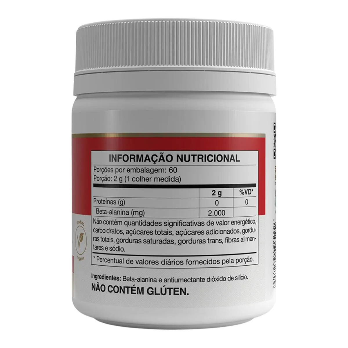 QUANTIDADE DIÁRIA MÁXIMA DE 2 g COM DOSES DIVIDIDAS DE, NO MÁXIMO, 300 mg, COM INTERVALO DE DUAS HORAS ENTRE AS DOSES. CADA PORÇÃO DE 50mL DO PRODUTO PRONTO PARA O CONSUMO CONTÉM QUANTIDADE APROXIMADA, NÃO SUPERIOR À 286mg DE BETA-ALANINA. Ingredientes: Beta-alanina e antiumectante dióxido de silício. NÃO CONTÉM GLÚTEN. Cuidados e conservação: - Manter o produto bem fechado e conservar ao abrigo da luz, calor, odor e umidade.