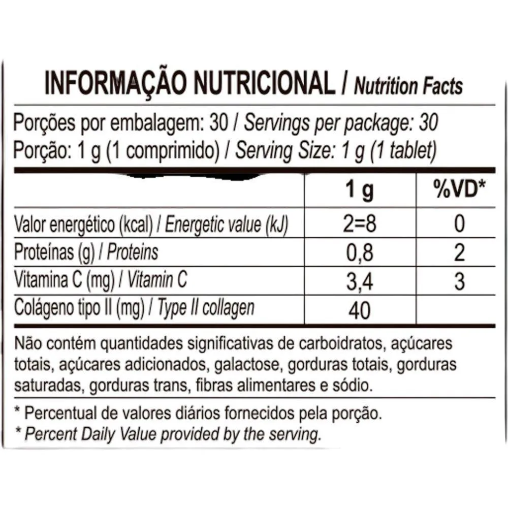 Não contém glútenOs ingredientes incluem colágeno hidrolisado, colágeno tipo II não hidrolisado, estearato de magnésio (utilizado como lubrificante) e outros excipientes essenciais à formulação do produto. É desenvolvido com alto padrão de qualidade para atender às necessidades dos consumidores.