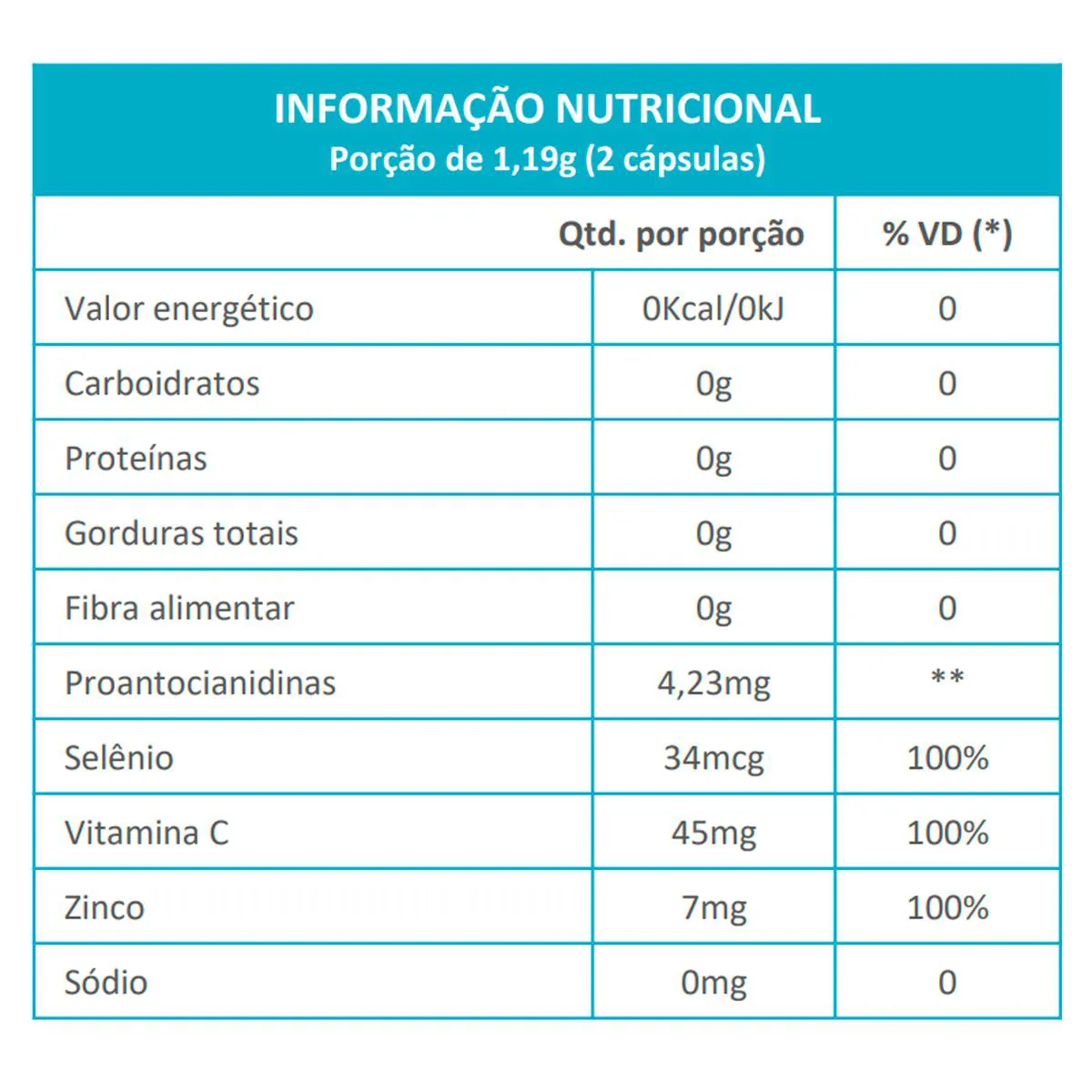 Cranberry em pó, vitamina c revestida, zinco e selênio, excipiente: silicato de magnésio, antiumectante: dióxido de silício, cápsula: gelatina.