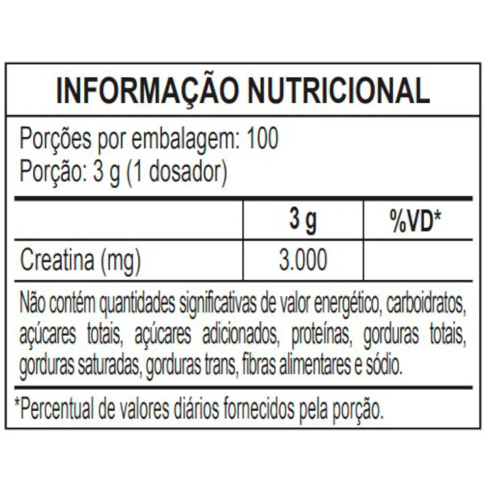 - Suplemento 100% de creatina monohidratada, sem adição de corantes ou conservantes.