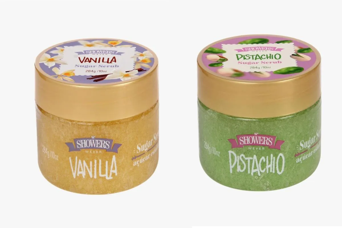 O kit consiste em dois esfoliantes corporais da marca WEVER SHOWERS, desenvolvidos para limpeza e cuidado da pele, com fragrâncias de Vanilla e Pistachio.
