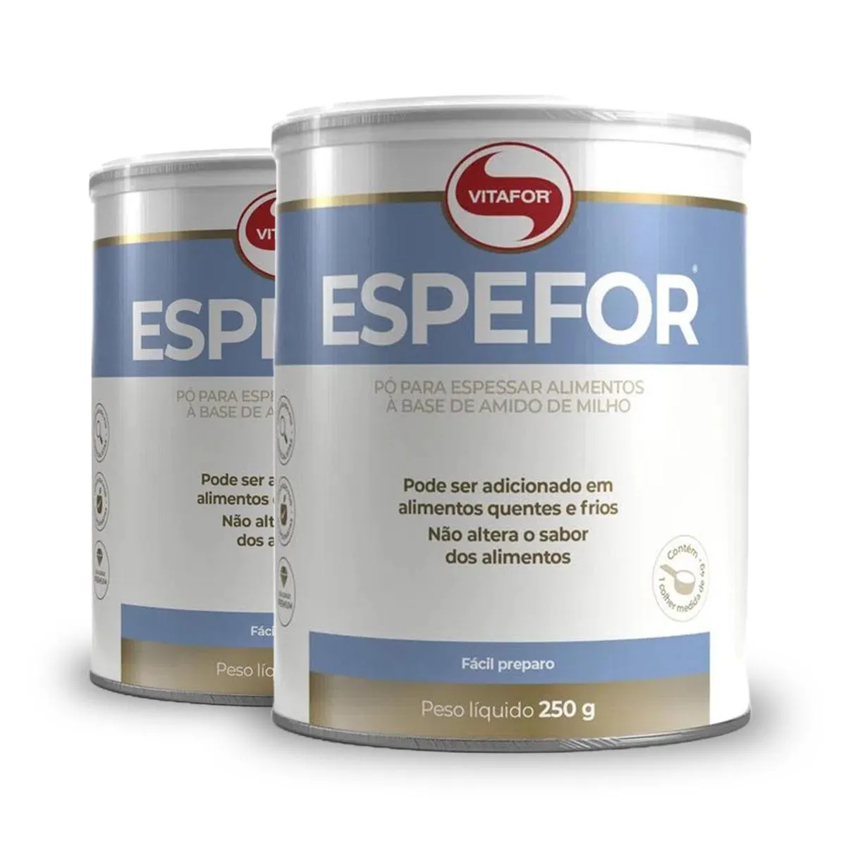 Kit 2 Espefor 250g Vitafor Espefor® é um espessante em pó que pode ser adicionado a bebidas e alimentos quentes ou frios como água, chá, sucos, sopas e purês. Diferenciais: - O uso de Espefor permite as consistências de xarope, mel ou pudim de acordo com a necessidade e dosagem indicada.