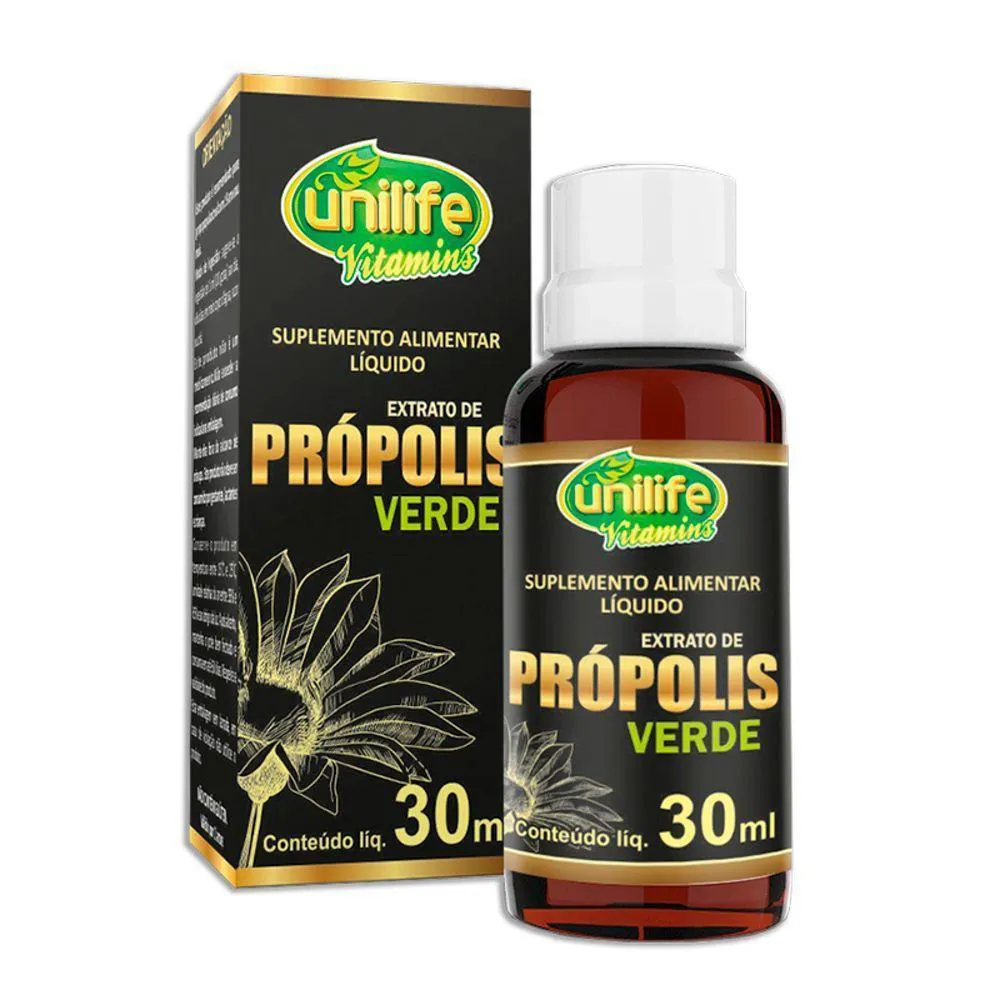 Kit 2 Extrato de Própolis Verde Unilife 30mlSobre o produtoEXTRATO PRÓPOLIS VERDE Unilife Vitamins Desenvolvido a partir de extrato de própolis verde em pó, o produto é livre de glútenModo de usar1 gota ao dia.Ingredientesextrato de própolis 20%, ácido ascórbico, bisglicinato de zinco, selenometionina, antiumectantes: silicato de magnésio, estearato de magnésio e dióxido de silício.