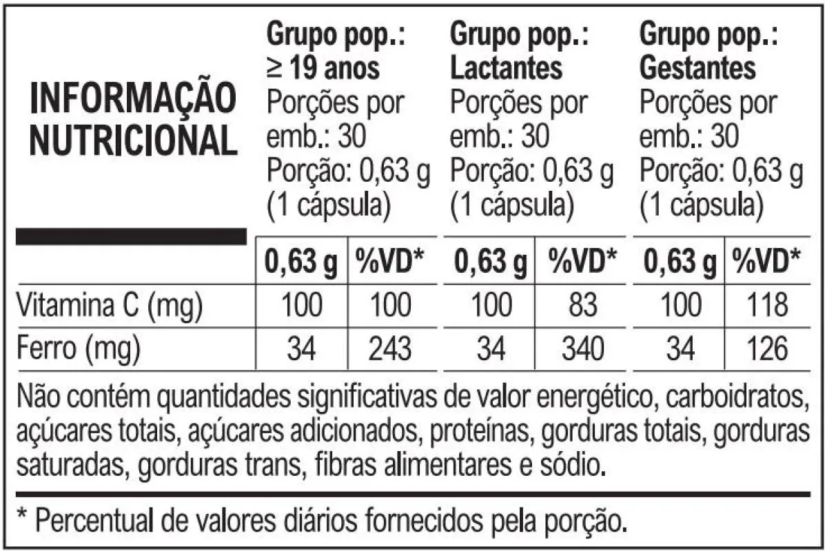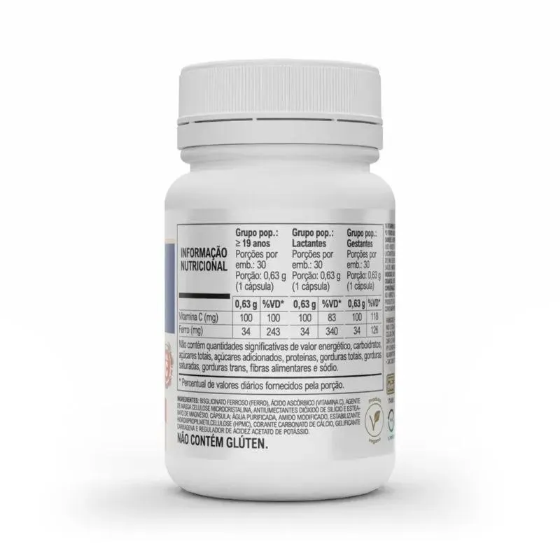 FERRO PLUS é um suplemento alimentar com alta concentração de ferro e vitamina c. Benefícios: - O ferro e a Vitamina C auxiliam no metabolismo energético e no funcionamento do sistema imune; - O ferro auxilia na formação das células vermelhas do sangue, no transporte do oxigênio no organismo e no processo de divisão celular; - A vitamina C auxilia na absorção de ferro dos alimentos, na proteção dos danos causados pelos radicais livres, na formação do colágeno, na regeneração da forma reduzia da vitamina e, e no metabolismo de proteínas e gorduras. Diferenciais: - Alta concentração e biodisponibilidade; - Bisglicinato ferroso (ferro quelato): 172 mg por porção; - Ferro elementar: 34 mg por porção; - Fonte de Vitamina C. Este produto não é um medicamento. Não exceder a recomendação diária de consumo indicada pelo fabricante. Procure orientação profissional.