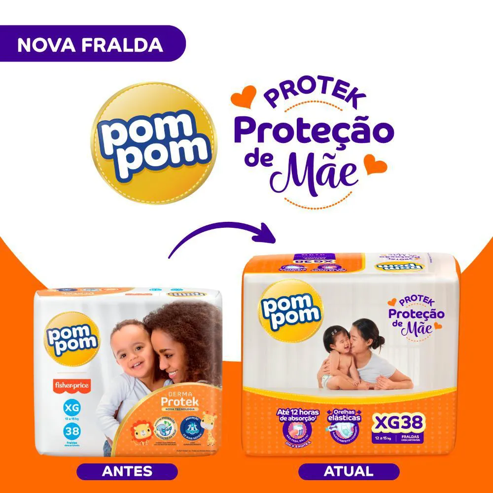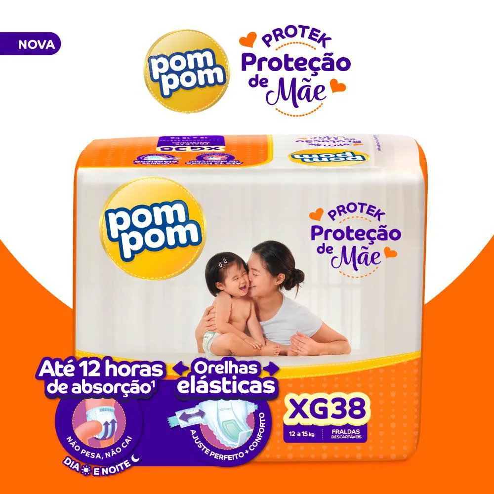Pom Pom Protek Proteção de Mãe é a proteção que cuida do seu bebê por até 12 horas, garantindo dias e noites tranquilas, com orelhas elásticas que garantem mais conforto e um ajuste perfeito na cinturinha do bebê, e canal superabsorvente que distribui o xixi mais rápido, evitando que a fralda pese e caia entre as perninhas do bebê.
