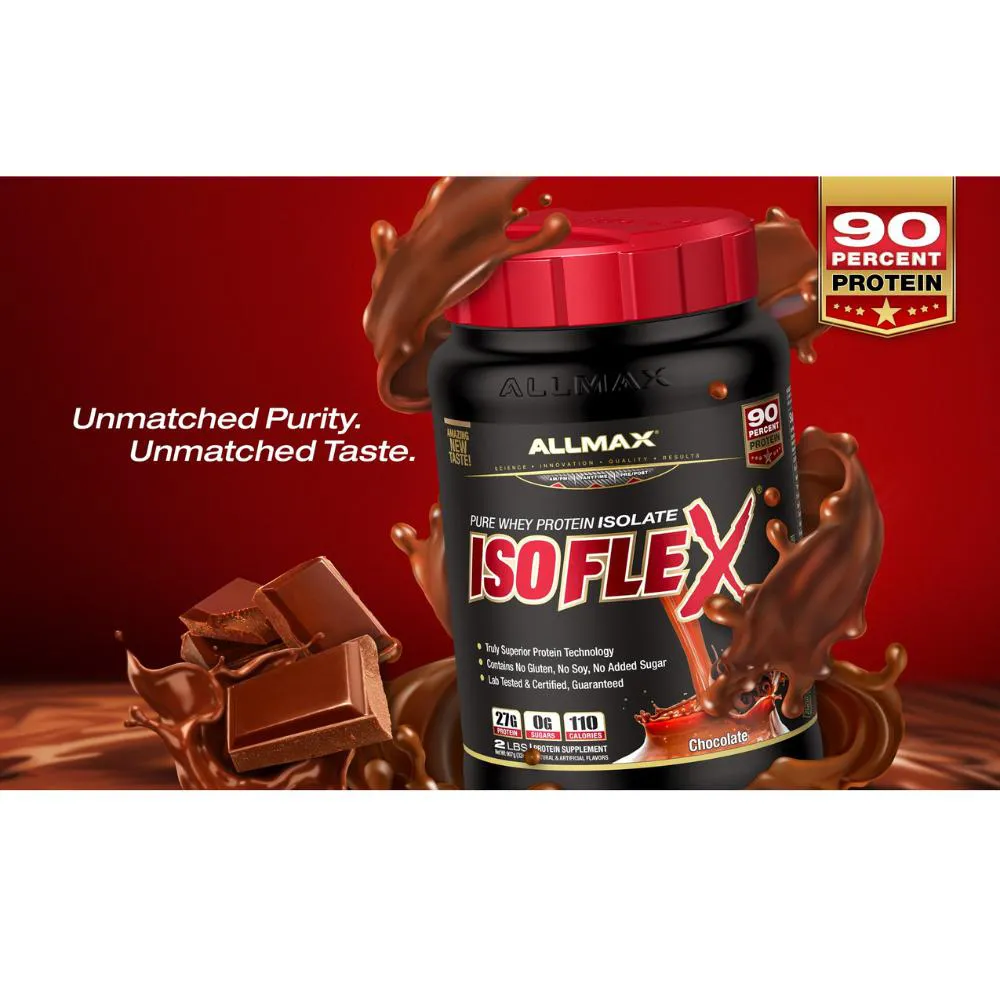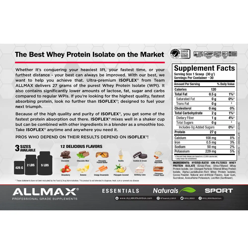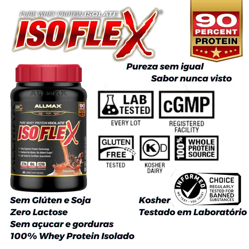 ISOFLEX® - WHEY PROTEIN VERDADEIRAMENTE SUPERIOR ISOFLEX é o melhor em sabor e qualidade. Não apenas o ISOFLEX possui uma nova aparência e um ótimo sabor, utilizando tecnologia de ponta, mas também é whey protein isolado do puro soro do leite. O ISOFLEX é significativamente mais baixo em lactose, gordura, açúcar e carboidratos, em comparação com os WPIs regulares! Se você está procurando a proteína de mais alta qualidade, mais premium e de absorção mais rápida, não procure além do ISOFLEX: um verdadeiro Whey Protein Isolado superior. O ISOFLEX não contém absolutamente NENHUM Concentrado de Soro. Os concentrados têm níveis mais altos de gordura e açúcares com uma porcentagem menor de proteína e menor biodisponibilidade do que os isolados. Enquanto outras marcas usam concentrados, os usuários do ISOFLEX sabem que os isolados têm uma porcentagem de proteína superior e não aceitarão misturas não isoladas. Isso mesmo, Isolado Puro de Proteína do Soro do Leite em suas mãos, oferecendo incríveis 90% de pureza de proteína! 27 g de Proteína Pura que foi testada em laboratório, certificada e aprovada. Devido à alta qualidade e pureza do ISOFLEX, você obtém uma das absorções de proteína mais rápidas que o mercado tem a oferecer. Tome o ISOFLEX a qualquer hora e em qualquer lugar que você precisar. QUALIDADE SUPERIOR O ISOFLEX foi produzido em uma instalação registrada na cGMP, é testado e certificado como livre de glúten e proteína kosher certificada. Além disso, o ISOFLEX é certificado como um produto testado pelo Informed-Choice para substâncias proibidas, conforme indicado pelo selo de aprovação em cada embalagem de ISOFLEX da ALLMAX. O MELHOR ISOLADO DE PROTEÍNA DE SORO DO MERCADO RAZÃO HÍBRIDA DE ISOLADO (HRI) - TECNOLOGIA DE FILTRAÇÃO DE ÍONS BETA-LACTOGLOBULINA 53,8% ALFA-LACTOALBUMINA* 20,3% GLICOMACROPEPTÍDEO 18,8% BIPEPTÍDEOS E TRIPEPTÍDEOS 4,3% IMUNOGLOBULINA 2,5% ALBUMINA DE SORO BOVINO 1,6% LACTOFERRINA 0,1% *15% a mais do que os Isolados Típicos. O ISOFLEX utiliza uma tecnologia única de extração de proteína chamada Filtração de Íons de Razão Híbrida (HRI). Uma combinação de duas tecnologias de purificação de isolados incorporada em uma proporção específica para produzir um pó de Isolado de Proteína do Soro do Leite verdadeiramente superior e ultra puro. A tecnologia de ponta HRI permite que o ISOFLEX mantenha um rendimento de proteína excepcionalmente alto, ao mesmo tempo que mantém frações de soro bioativas aprimoradas. Este processo é uma das razões pelas quais o Isoflex é considerado por muitos como o melhor isolado de proteína de soro no mercado mundial. O ISOFLEX NÃO CONTÉM ABSOLUTAMENTE NENHUM WHEY CONCENTRADO! Isso mesmo, Puro Isolado de Proteína de Soro em suas mãos, proporcionando incríveis 90% de proteína! Apenas frações de proteína nativas e intactas. 27 g de Proteína Pura que foi testada em laboratório, certificada e aprovada. O ISOFLEX agora possui a tecnologia SCOOP-LOCK™ Foram-se os dias em que você tinha que cavar através de sua proteína para pegar a colher. O SCOOP-LOCK foi ergonomicamente projetado para travar seu scoop em um único lugar! E ele está bem ali no topo do seu ISOFLEX quando você o abre! O Scoop-Lock está disponível em todos os produtos ISOFLEX, ALLWHEY Gold, ALLWHEY Classic e HEXAPRO, e é exclusivo da ALLMAX. Procure pela nova e resistente tampa Ergo-Lid™ nos produtos ALLMAX com o Scoop-Lock™ interno! O SABOR QUE VOCÊ DESEJA - OS RESULTADOS QUE VOCÊ EXIGE A primeira coisa que realmente diferencia o ISOFLEX de qualquer outro whey protein do mercado é o seu sabor. Ele é incrível! E com 3 sabores deliciosos para escolher, com certeza haverá um que satisfaça suas papilas gustativas. O ISOFLEX está disponível em frascos de 2 lb e 5 lb (Baunilha, Chocolate e Morango) Perguntas Frequentes: POSSO USAR O ISOFLEX COM OUTROS SUPLEMENTOS? Sim, você pode. Dependendo de seus objetivos, o Isoflex complementa muitos outros produtos da AllMax Nutrition para ajudar você a levar seu treinamento ao próximo nível. O Isoflex é altamente versátil e é considerado uma base ideal, ou seja, pode ser usado com praticamente todos os outros suplementos. Se você está tentando perder peso ou tonificar, experimente combinar o RapidCuts Shredded com o Isoflex. Se você está tentando ganhar massa ou peso, o Aminocore e a Glutamina são excelentes produtos para experimentar, além do próprio Isoflex. COMO DEVO TOMAR O ISOFLEX? USO SUGERIDO PELO FABRICANTE: Combine uma medida de 30g de pó de proteína Isoflex com 1/2 copo ou 120 ml de água, suco ou leite (a maioria escolhe água ou leite desnatado), dependendo da sua preferência, a qualquer momento durante o dia em que você precisa de um impulso de proteína. A maioria dos atletas com necessidades elevadas de proteína duplica cada porção com 2 medidas de Isoflex e cerca de 1 copo (300 ml de água), fornecendo 54 gramas de proteína pura. ISOLADO DE PROTEÍNA DE SORO VS. CONCENTRADO: O QUE FAZ DO ISOFLEX SUPERIOR A OUTROS WHEY PROTEINS NO MERCADO? A primeira coisa que realmente diferencia o Isoflex de qualquer outro whey protein no mercado é o seu sabor. Ele é incrível! Em segundo lugar, e mais importante, ele foi formulado apenas com a mistura mais superior disponível - isolado de proteína do soro do leite. Muitos outros whey proteins no mercado usam concentrados e outras misturas inferiores que contêm apenas 30-80% de proteína e incluem níveis mais altos de carboidratos, lactose (açúcar do leite) e gorduras. Além disso, o perfil de macronutrientes do Isoflex é excepcional e fornece incríveis 27 gramas de proteína pura! O ISOFLEX VAI ME DAR MÚSCULOS GRANDES E VOLUMOSOS? Para aqueles que estão tentando perder peso ou tonificar, tomar suplementos de proteína como o Isoflex não vai auxiliar da formação de músculos grandes e volumosos. Na verdade, o Isoflex pode até te ajudar a 