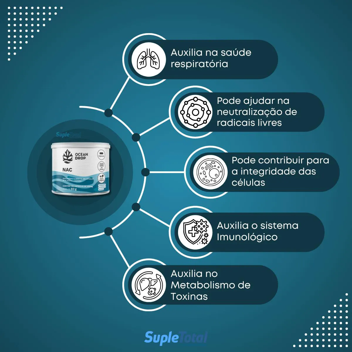 Benefícios do NAC para a saúde Encontrados em estudos científicos *Este suplemento alimentar não é um medicamento e não deve ser utilizado como substituto para tratamentos médicos prescritos. Consulte sempre um profissional de saúde antes de iniciar qualquer suplementação. Os benefícios do NAC para a saúde são principalmente devido à sua função como precursor da glutationa, que é um poderoso antioxidante. Essa substância tem se destacado como uma opção versátil que pode contribuir em uma variedade de aspectos do bem-estar humano. Abaixo,conheça os benefícios do NAC encontrados em estudos: Relacionados à saúde respiratória Um estudo analisou o uso da N-acetilcisteína (NAC) em pacientes com foco na redução do estresse oxidativo e na saúde respiratória. A pesquisa sugere que a NAC pode ser uma opção a ser considerada para a saúde da função respiratória. Relacionados à imunidade Um estudo publicado em 2022 verificou que a N-acetilcisteína (NAC) atua na restauração das respostas das células imunitárias através da inibição da apoptose das células T e do combate aos radicais livres. Relacionadas à capacidade antioxidante A ação antioxidante proporcionada pelo NAC têm chamado a atenção de atletas e praticantes de exercícios. Estudos mostram que a N-acetilcisteína (NAC) é usada como suplemento esportivo porque ajuda a controlar o dano oxidativo causado pelo exercício, graças às suas propriedades antioxidantes e à capacidade de manter os níveis de glutationa