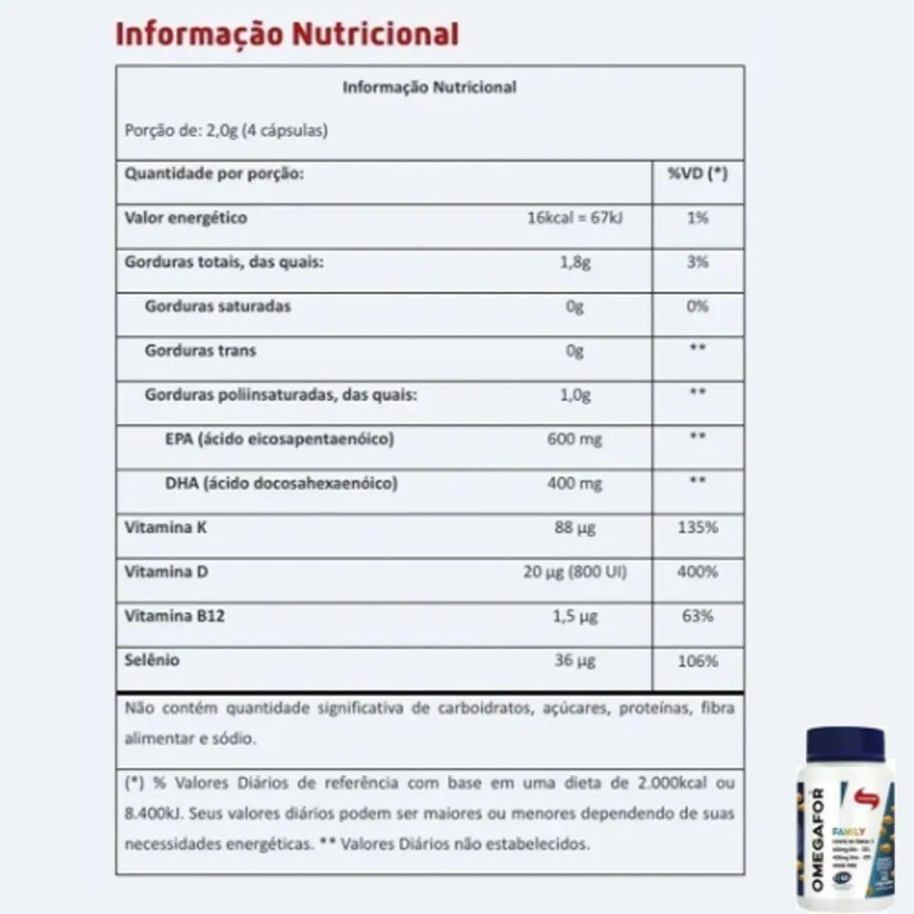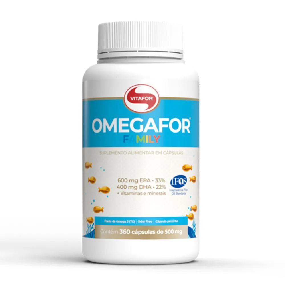Kit 2 Ômegafor Family Ômega 3 Vitafor 360 cápsulasSobre o produtoSuplemento alimentar de óleo de peixe em cápsulas, fonte de Ômega 3.
