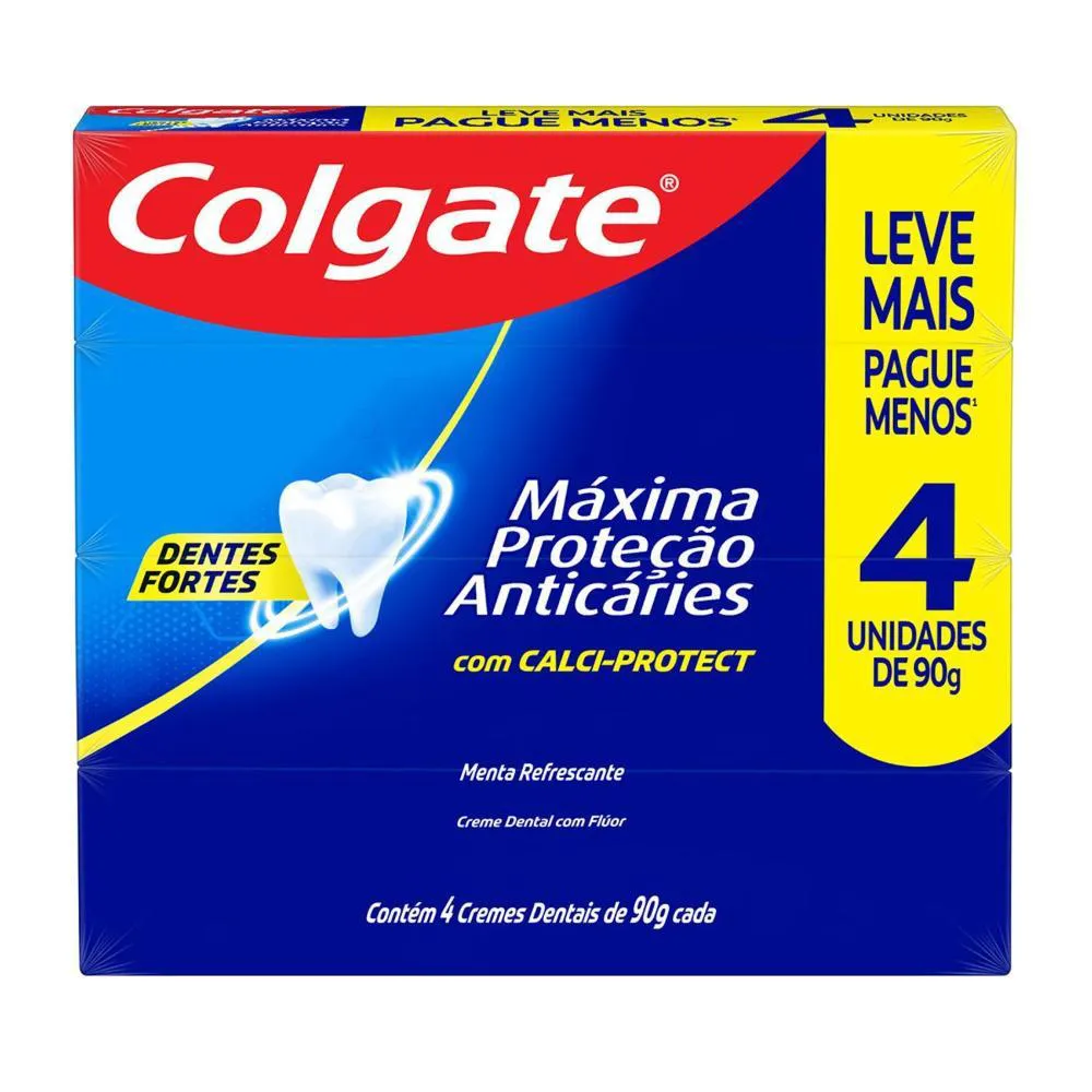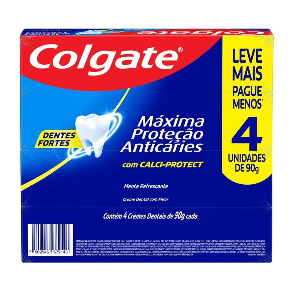A pasta de dente Colgate Máxima Proteção Anticáries contém micropartículas de cálcio, que fortalecem os dentes e previnem a cárie, protegendo a sua saúde bucal e da sua família.Benefícios para você:Contém micropartículas de cálcio, que previnem a formação da cárie nos dentes e em raízes expostas.Ajuda a fortalecer os dentes, limpando e protegendo seu sorriso.Possui sabor refrescante de menta para deixar o seu hálito com uma incrível sensação de refrescância.A ação do flúor fortalece o esmalte dos dentes.Leve Mais, Pague Menos! Contém 4 unidades de 90g.