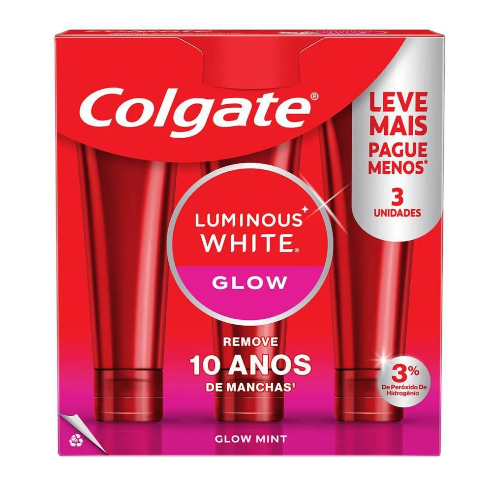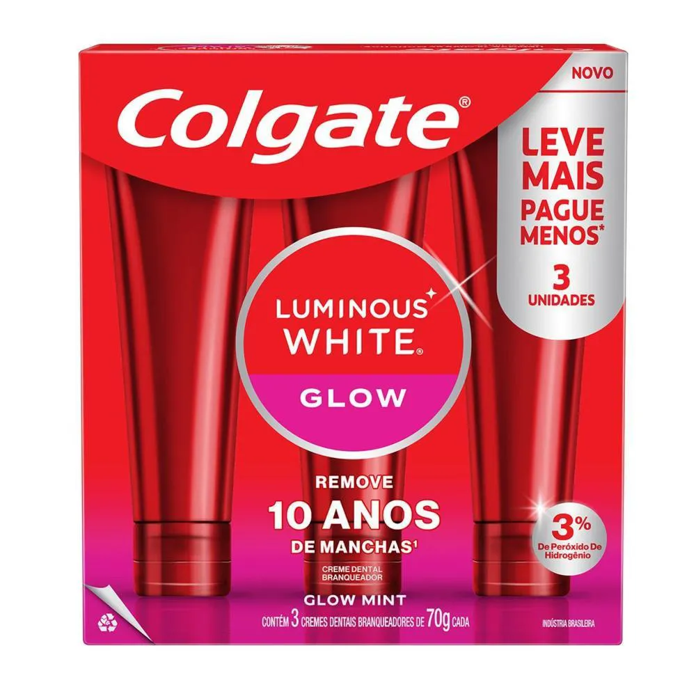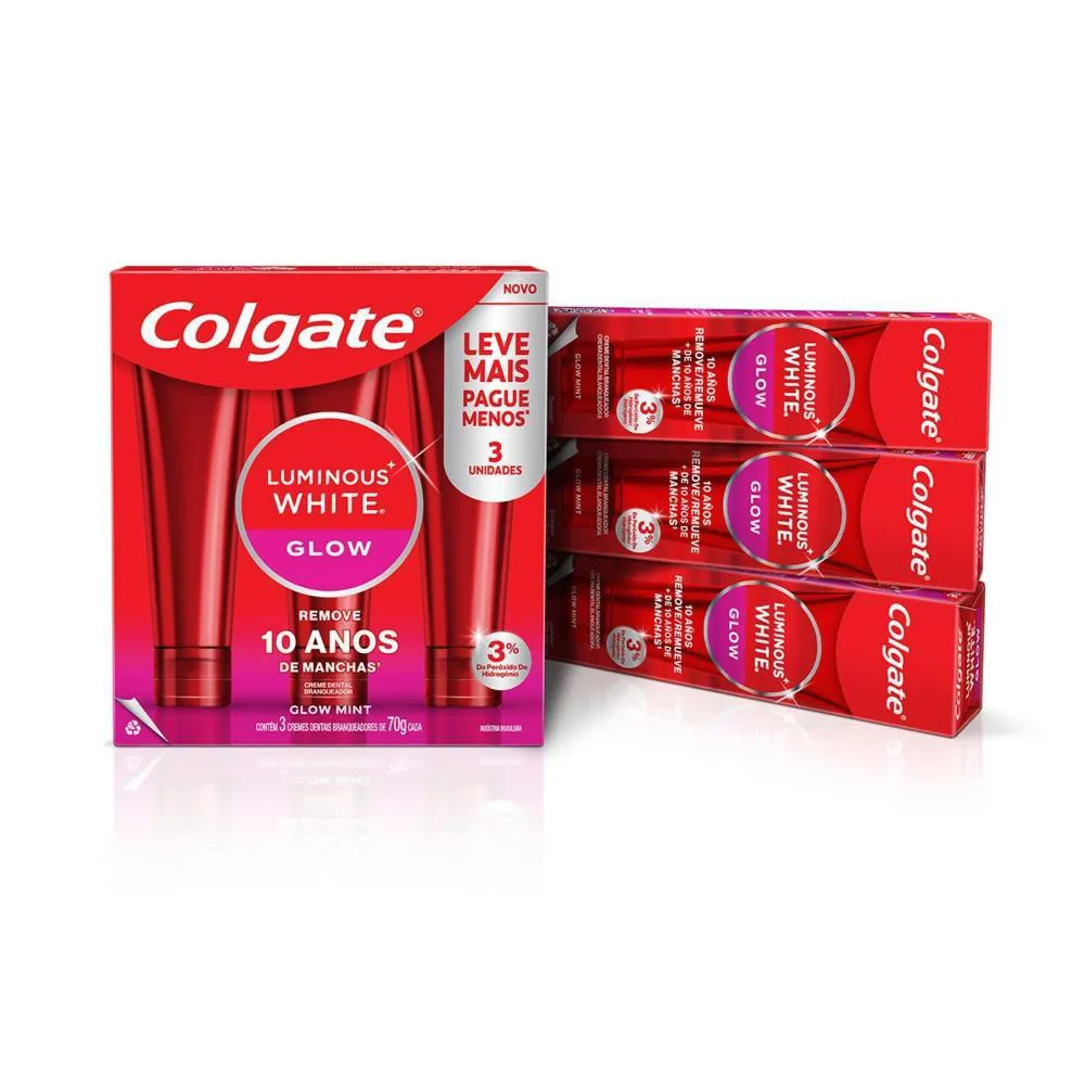 O produto é um kit de creme dental clareador composto por 2 packs, cada um contendo 3 unidades de 70g do Colgate Luminous White Glow. É um creme dental especialmente desenvolvido para clareamento dental, com 3% de peróxido de hidrogênio, utilizando a mesma tecnologia empregada por dentistas. Para que serve: remove manchas dos dentes em até quatro semanas, deixando os dentes naturalmente mais brancos, ao mesmo tempo em que promove higiene oral, previne mau hálito e protege o esmalte dental.