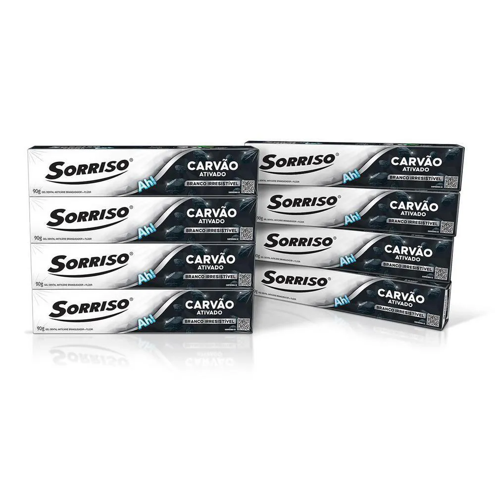 O produto é um kit composto por dois pacotes de creme dental, cada um contendo 4 unidades de 90g de Creme Dental Sorriso Carvão Ativado. Sua função principal é promover a higiene bucal, oferecendo ação branqueadora, proteção contra cáries e refrescância para os dentes e hálito.