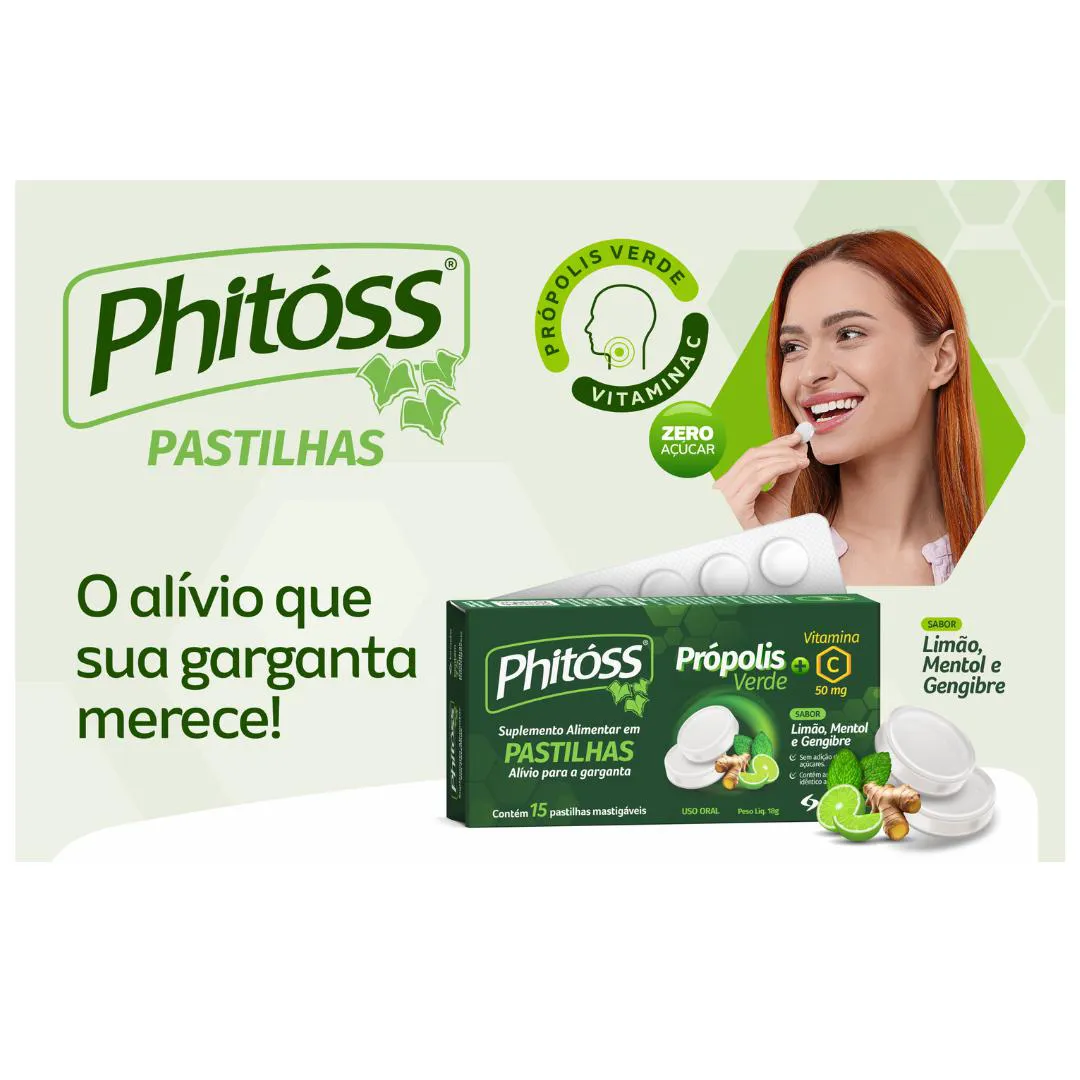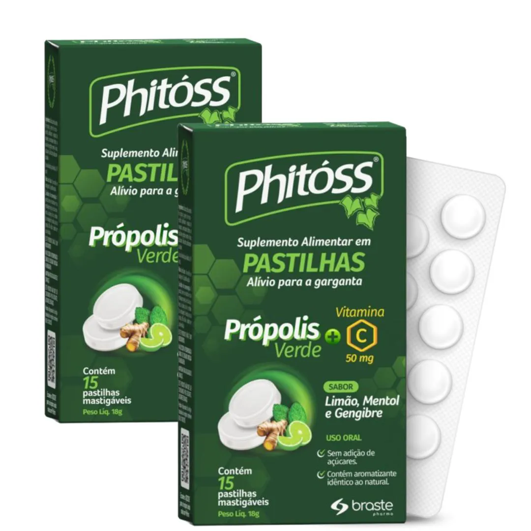 Esse lançamento de Phitóss vai cair na sua graça! pastilhas de Extrato de Própolis Verde, vitamina c com sabor de Limão, Mentol e Gengibre que agrada enquanto cuida da sua saúde, Sua propriedaddes antibacterianas e anti-inflamatórias podem ajudar a aliviar sintomas de dores na garganta causadas por infecções ou inflamações. Além da Vitamina C presente que fortalece o sistema imunológico e ajuda a previnir infecções e promovendo uma recuperação mais rápida. Recomenda-se o uso de até 2 pastilhas ao dia, para pessoas a partir de 19 anos. Crianças e mulheres gestantes é nescessário consultar um médico antes de usar as Pastilhas Phitóss. Contém 15 pastilhas mastigáveis em cada caixa