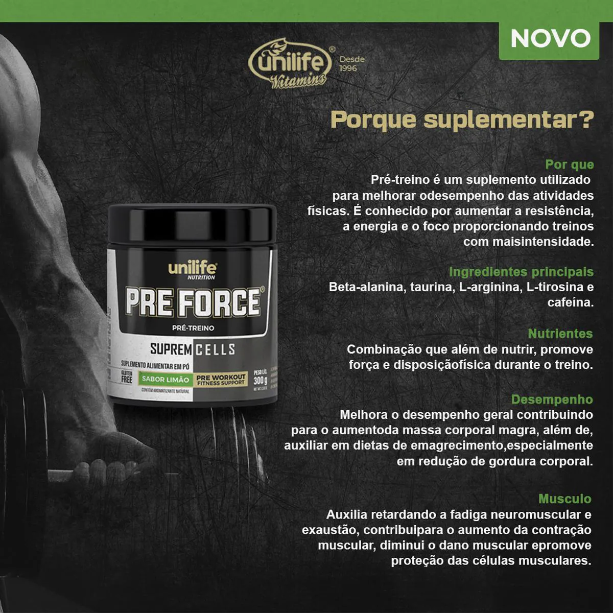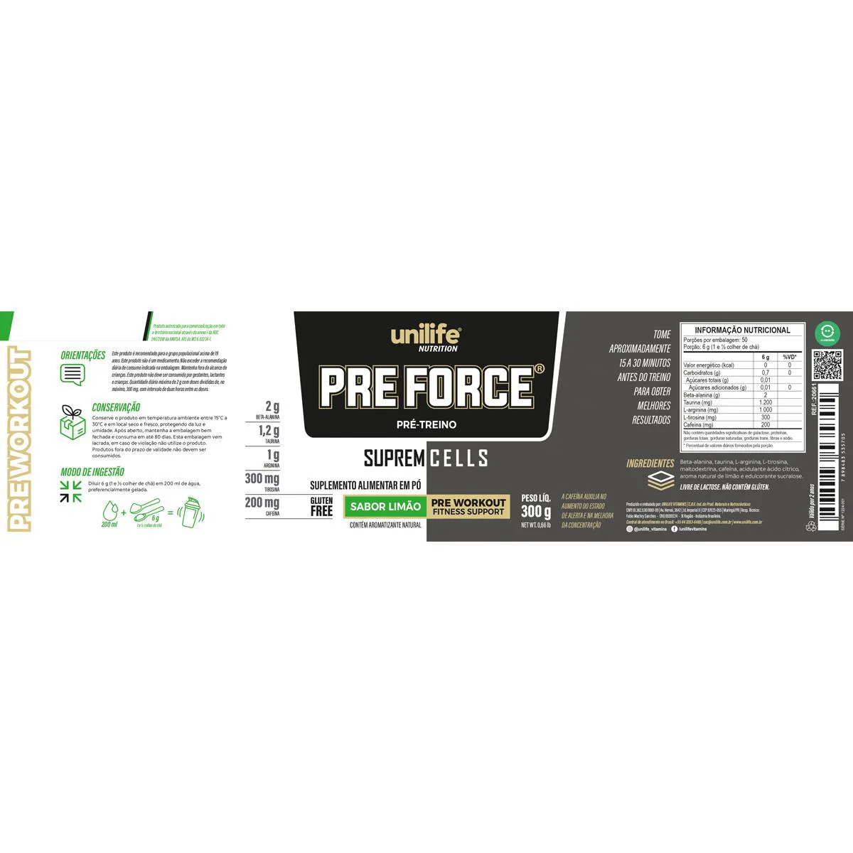 Pre Force Limão 300g Unilife Suplemento em pó à base de aminoácidos e cafeína, desenvolvido para complementar a alimentação de praticantes de atividades físicas. Possui sabor refrescante de limão e rápida dissolução em água, tornando seu consumo prático e conveniente. Composição e Características: