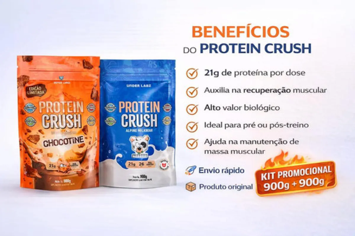O Protein Crush é um suplemento proteico em pó desenvolvido para complementar a alimentação de pessoas com rotina ativa, sendo uma alternativa prática para consumir proteína ao longo do dia.