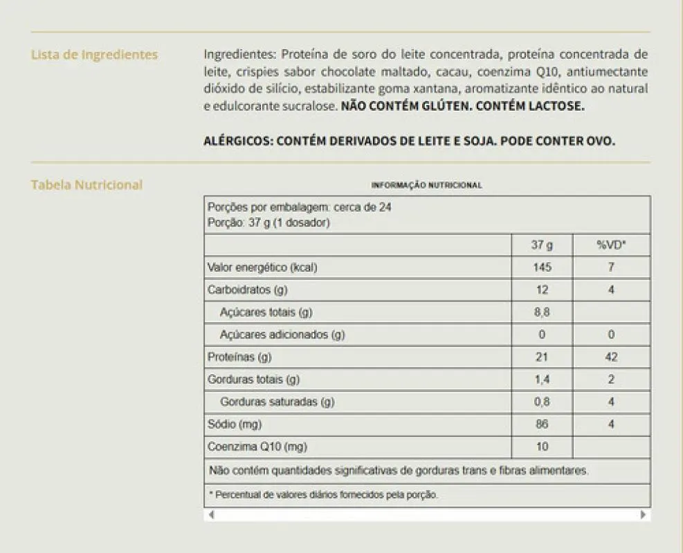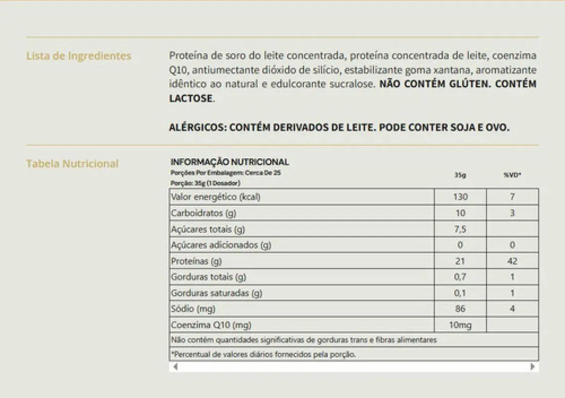 Cada porção oferece 21g de proteína, contribuindo para a ingestão diária desse nutriente importante para o organismo. Possui proteínas de alto valor biológico e pode ser consumido em diferentes momentos da rotina alimentar.