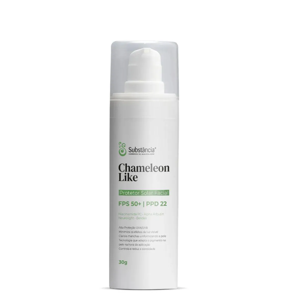 O Protetor Solar Chameleon Like FPS 50+ PPD 22 possui muito alta proteção contra os danos causados pelas radiações UVA, UVB e Luz Visível, mantendo a pele protegida em todas as ocasiões. Contém 4 ativos que uniformizam o tom da pele clareando manchas e melasmas, ação antioxidante e a tecnologia de pigmentos microencapsulados, que são liberados na hora da aplicação formando a maquiagem, com uma cobertura surpreendente. Aplique e veja a mágica acontecer! Além disso, possui efeito matte e de controle da oleosidade, com toque seco e aveludado, mantendo a pele sequinha e sem brilho ao longo de todo o dia. Formulado com uma fragrância leve e agradável.