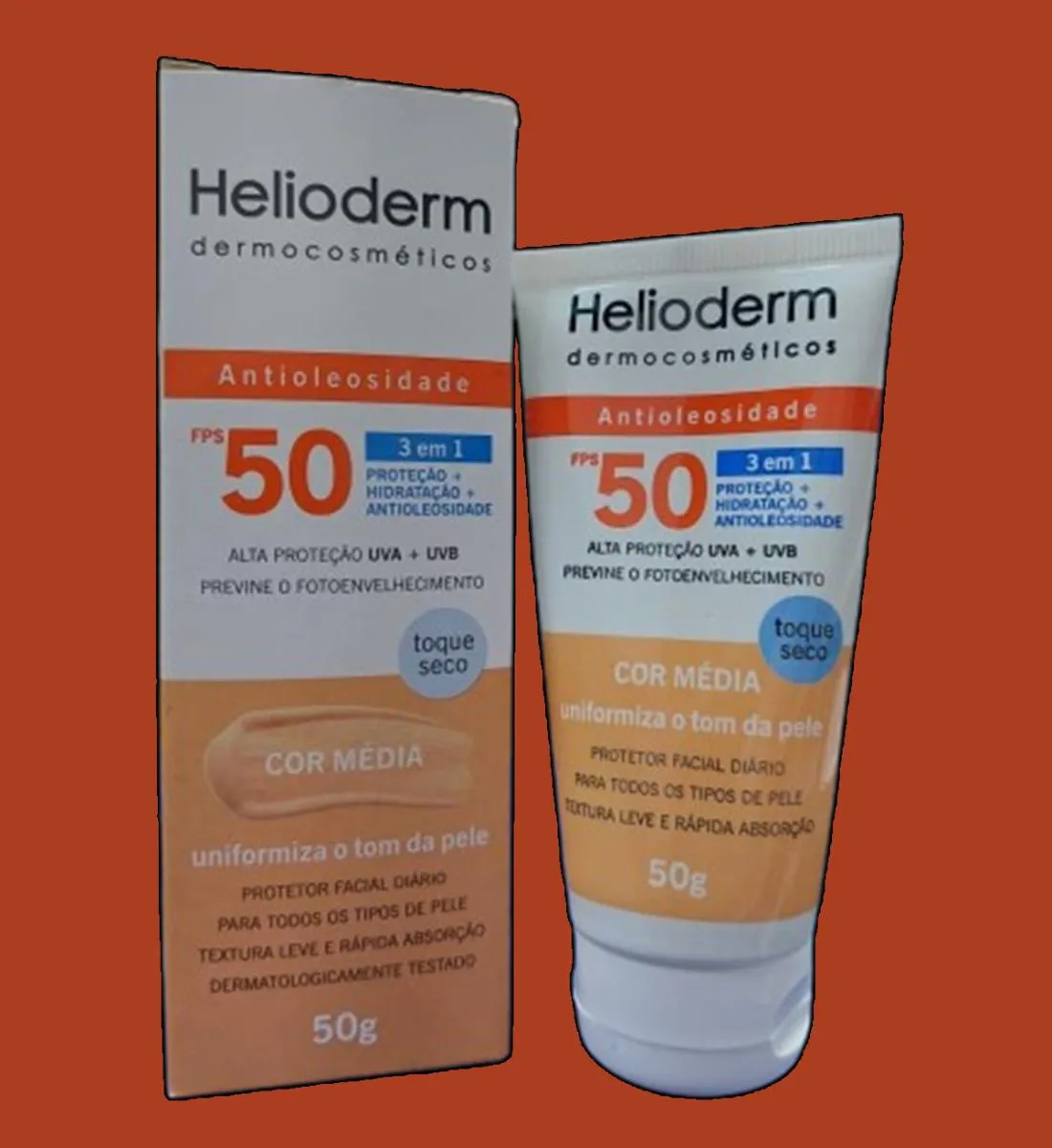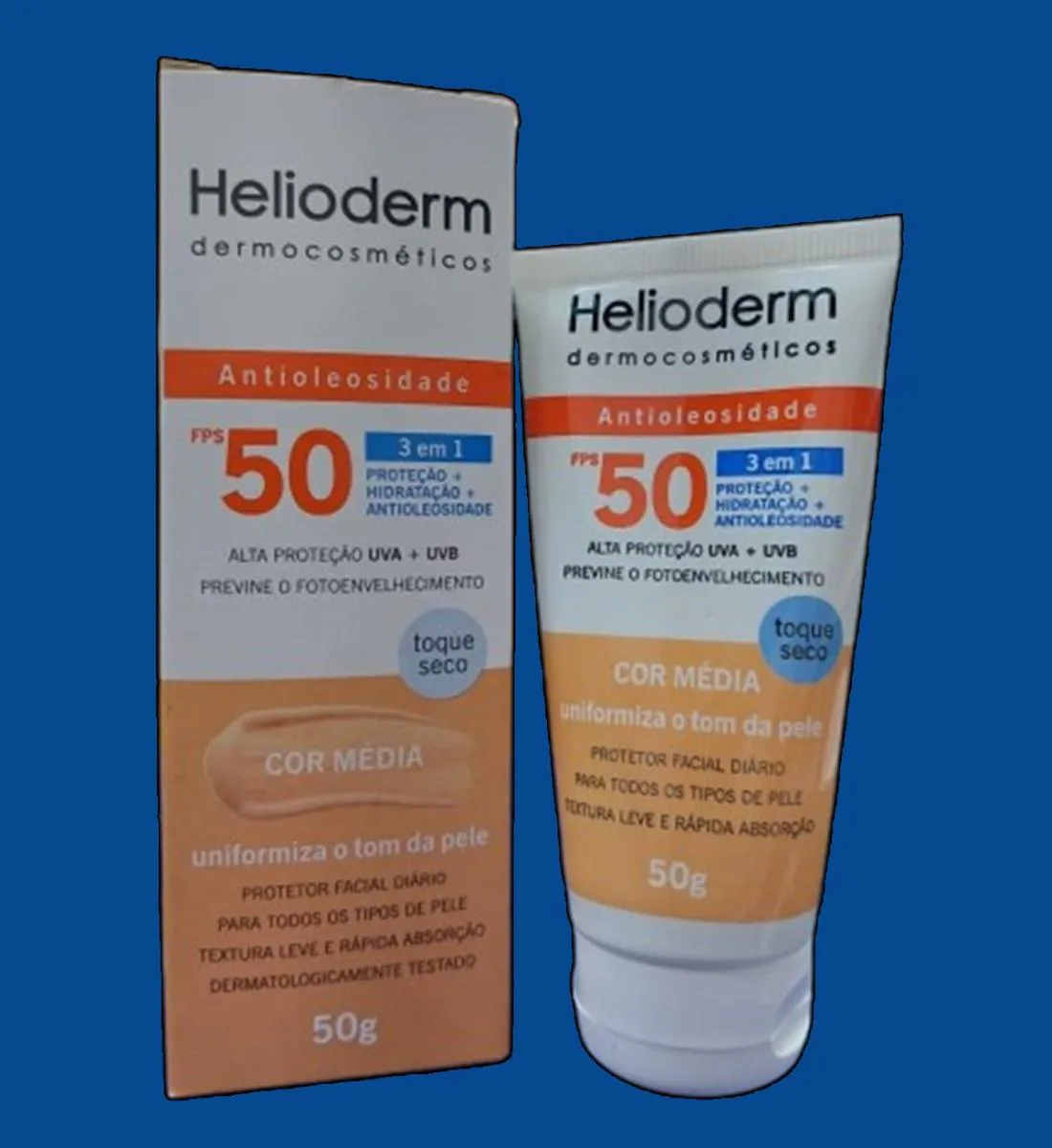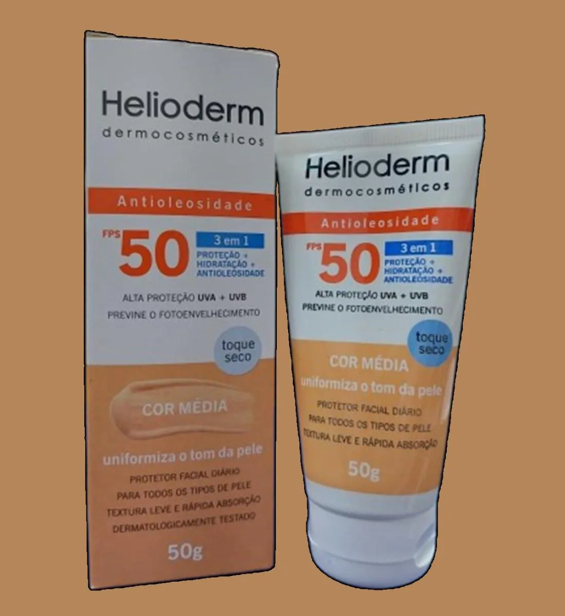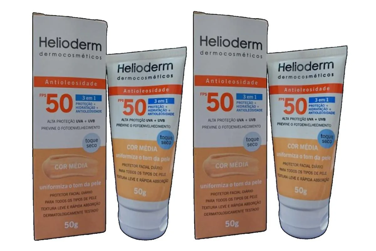 Kit 2 Protetor Solar Facial Fps 50 C/Cor Média 50g - Helioderm Protetor solar facial com cor e alta proteção FPS 50. Fórmula 3 em 1 que uniformiza o tom da pele, controla o brilho e oferece cobertura natural. Textura leve e toque seco, ideal para o uso diário. Imagens Meramente Ilustrativas. Todas as Informações Divulgadas são de Responsabilidade Exclusiva do Fabricante/fornecedor.
