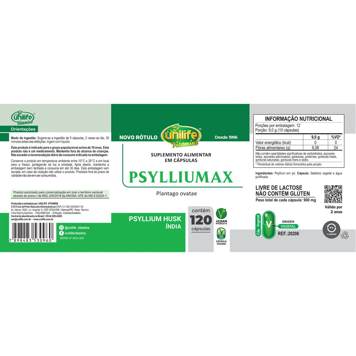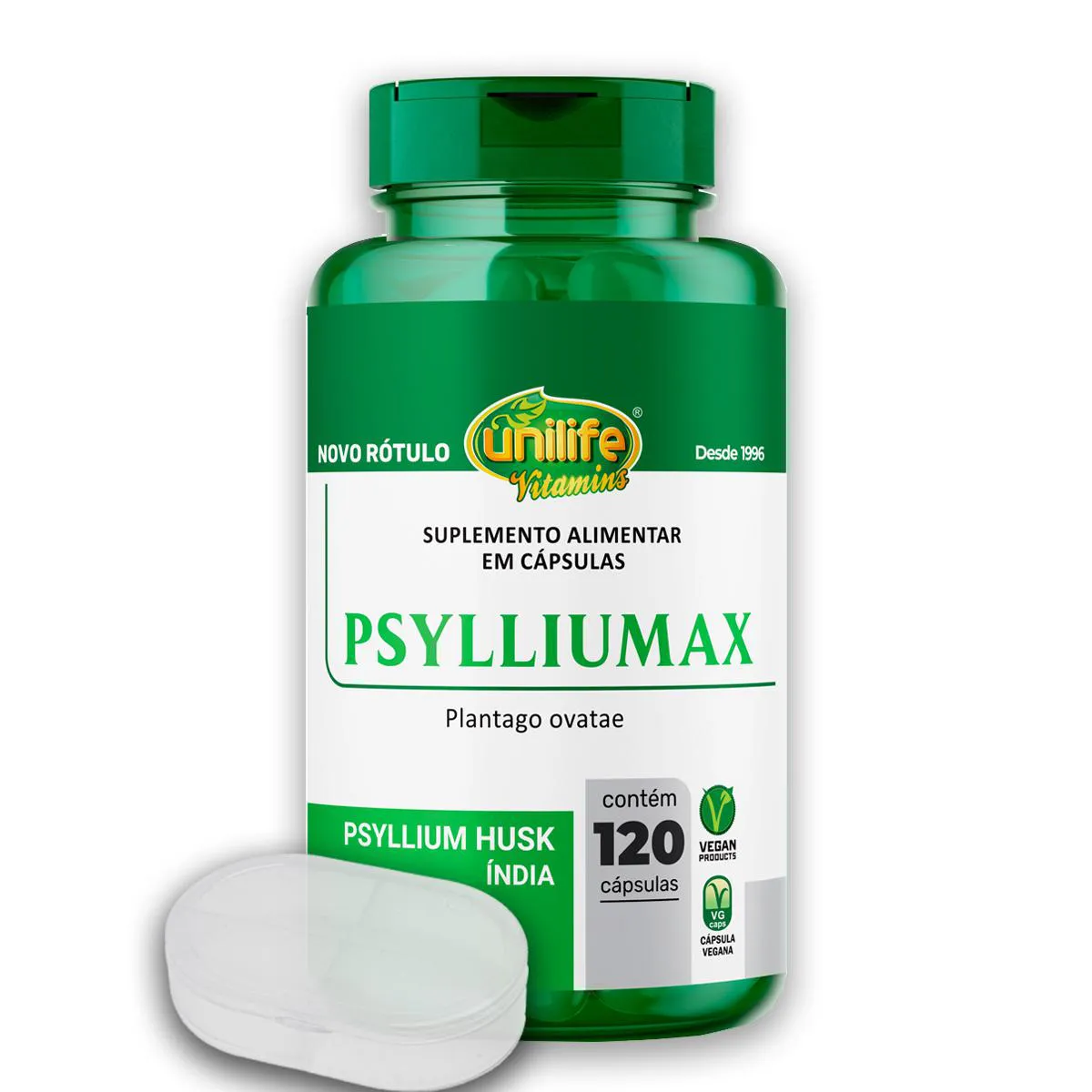 O produto é um suplemento alimentar em cápsulas formulado com psyllium, composto por 120 cápsulas, acompanhado de um porta cápsulas. Serve para auxiliar na alimentação de pessoas maiores de 19 anos, devendo ser consumido de acordo com orientação profissional, preferencialmente com líquidos.
