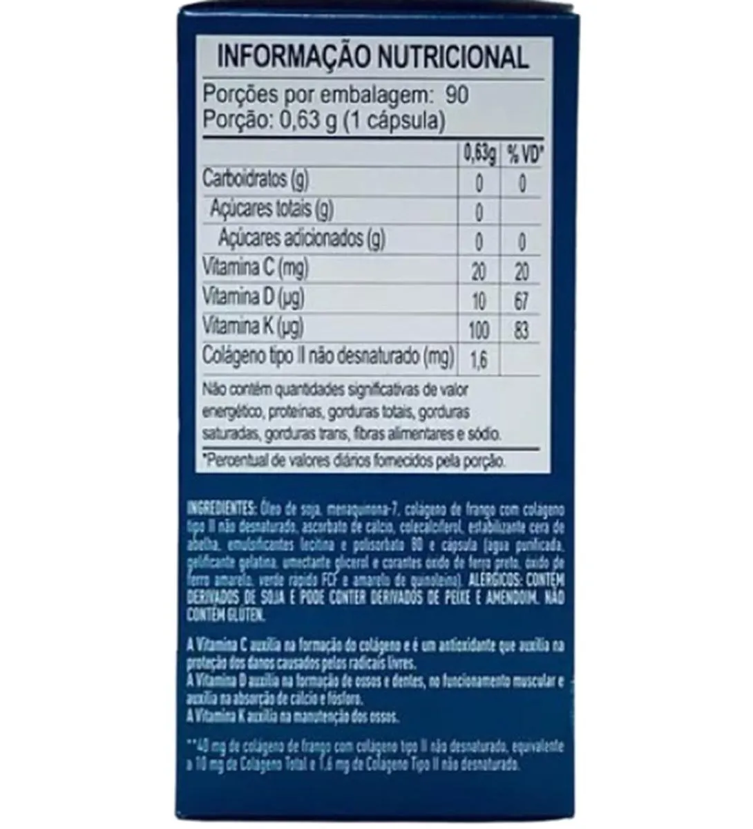 A Vitamina K2 também presente auxilia na fixação do cálcio nos ossos, a Vitamina D3 auxilia na absorção do cálcio e do fósforo e no funcionamento muscular e a vitamina c ajuda na formação do colágeno e na melhora do processo inflamatório. Imagens Meramente Ilustrativas. Todas as Informações Divulgadas são de Responsabilidade Exclusiva do Fabricante/fornecedor.
