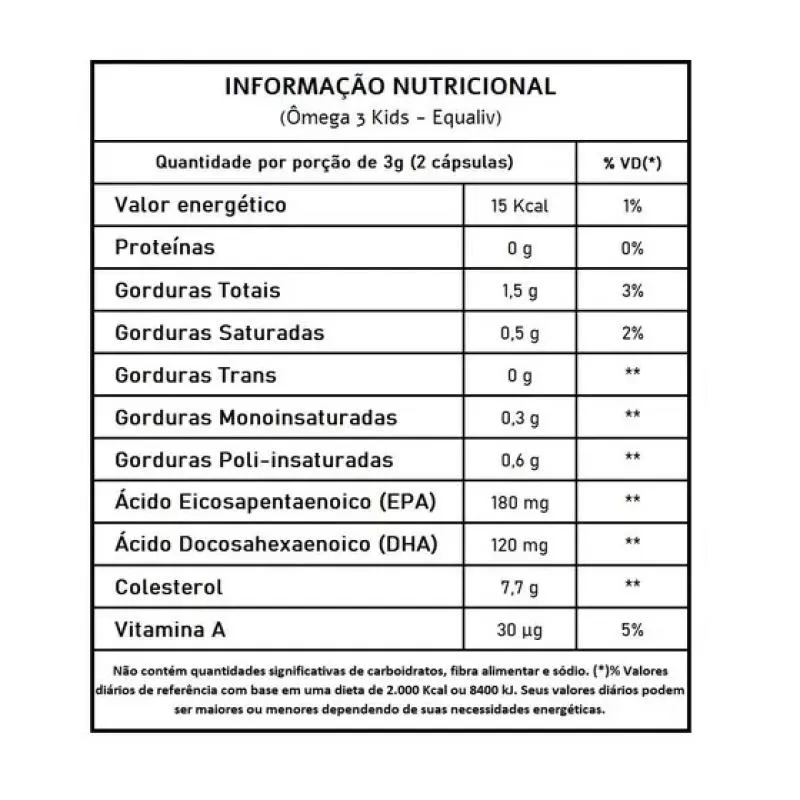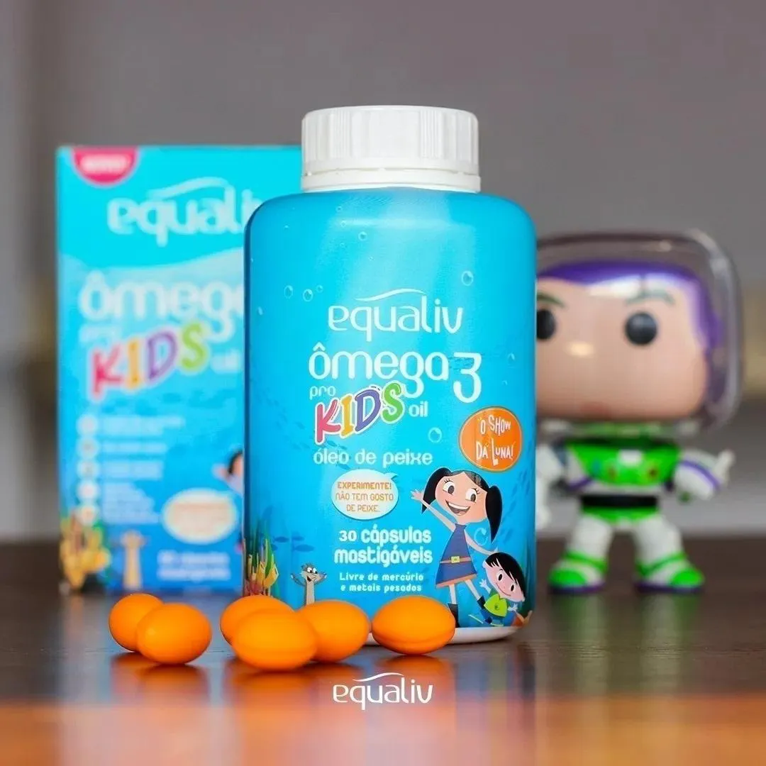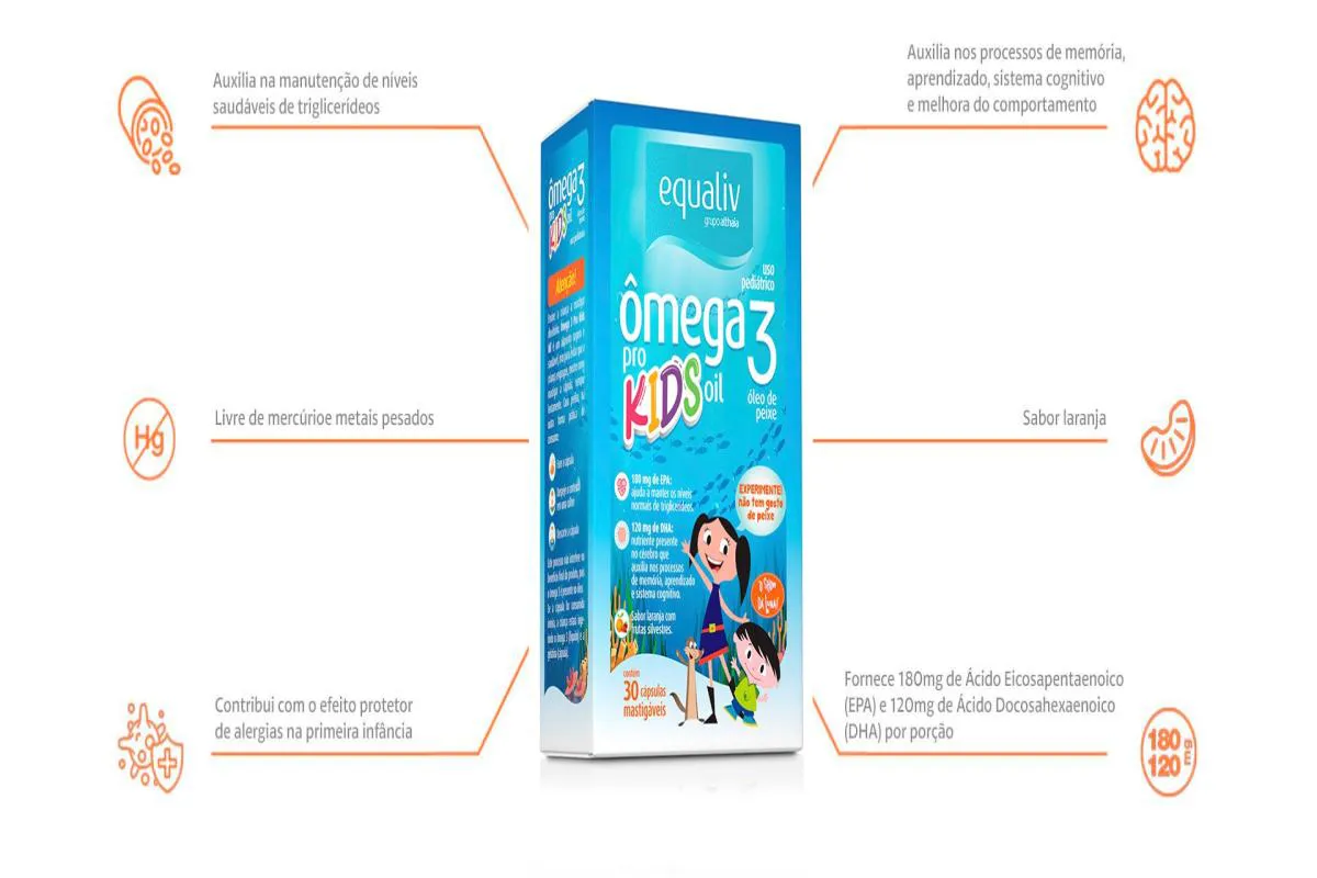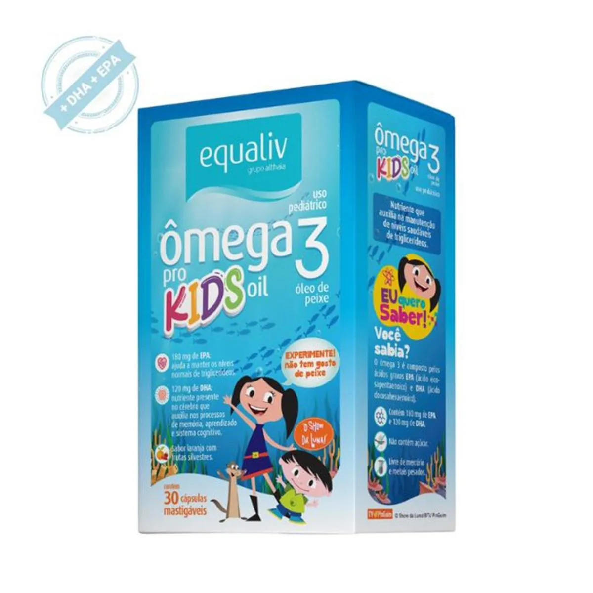 O Suplemento Equaliv Ômega 3 Pro Kids Oil Sabor Laranja 30Cps com é à base de óleo de peixe, rico em EPA e DHA (também presente em vários alimentos como frutos-do-mar, nozes, sementes, óleos vegetais e produtos fortificados).