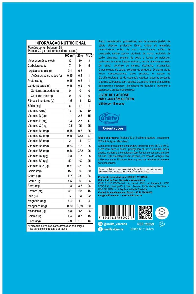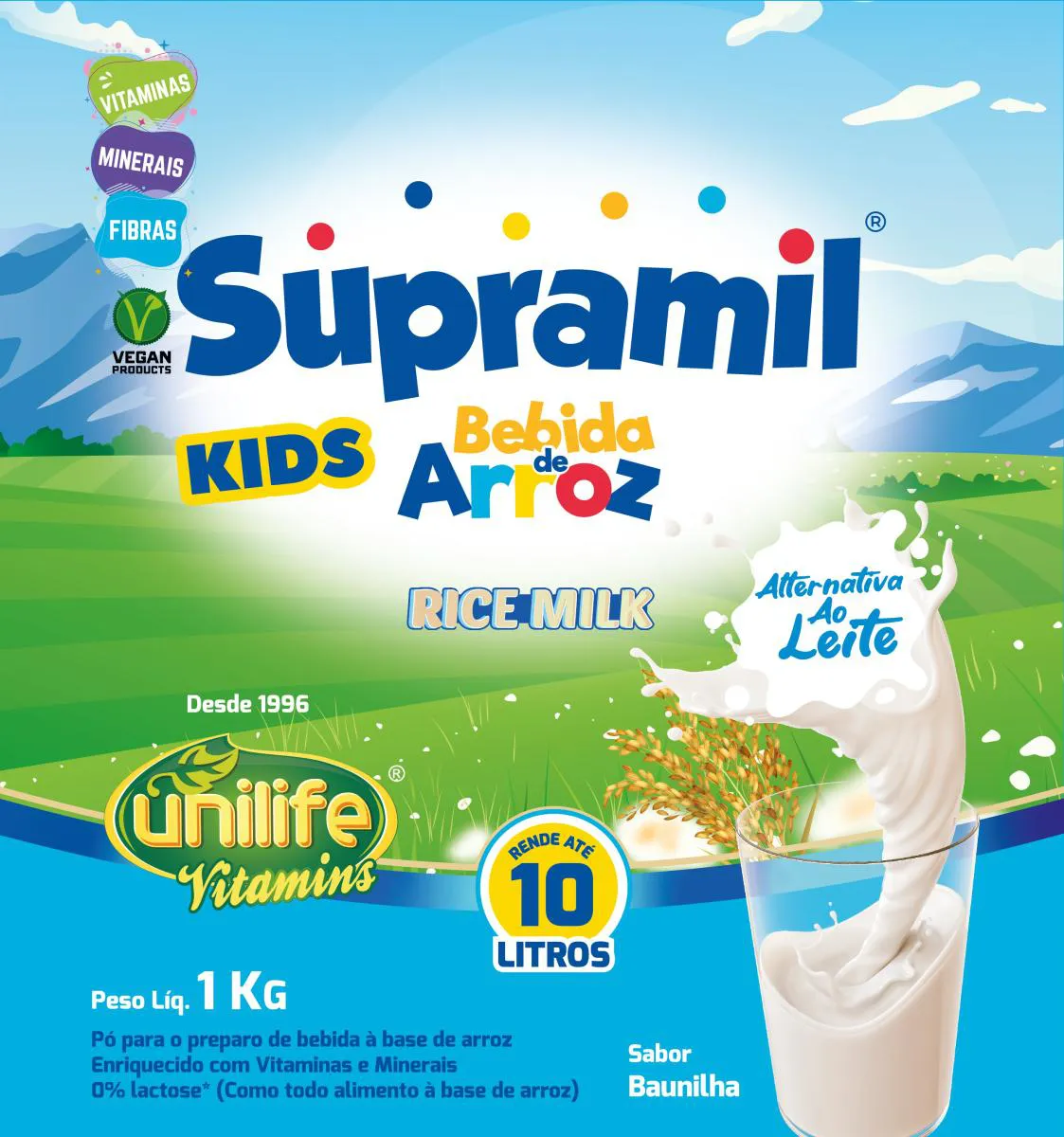 Supramil Bebida de Arroz Kids é um suplemento alimentar vegano em pó, formulado à base de arroz. O produto é livre de lactose e glúten. Possui aroma natural de baunilha e contém adição de vitaminas e minerais.IngredientesArroz, maltodextrina, polidextrose, mix de minerais (fosfato de cálcio dibásico, pirofosfato férrico, sulfato de magnésio monoidratado, sulfato de zinco monoidratado, sulfato de manganês, sulfato cúprico, picolinato de cromo, molibdato de sódio diidratado, selenito de sódio e iodeto de potássio), carbonato de cálcio, fosfato tricálcico, mix de vitaminas (acetato de retinol, cloridrato de tiamina, riboflavina, niacinamida, D-pantotenato de cálcio, cloridrato de piridoxina, D-Biotina, ácido fólico, cianocobalamina, ácido ascórbico e acetato de DL-alfa-tocoferol), pó de cogumelo Agaricus bisporus contendo vitamina D2 tratados com radiação UV, aroma natural de baunilha, edulcorantes sucralose, glicosídeos de esteviol e taumatina e espessante carboximetilcelulose.Modo de Preparo
