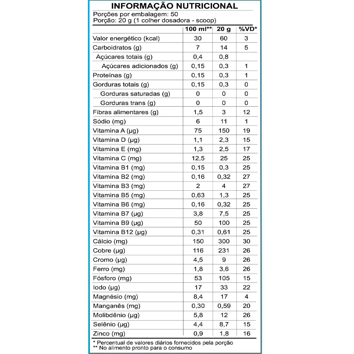 Adicionar 20g do pó em 200ml de água e misturar.Sugestão de Consumo