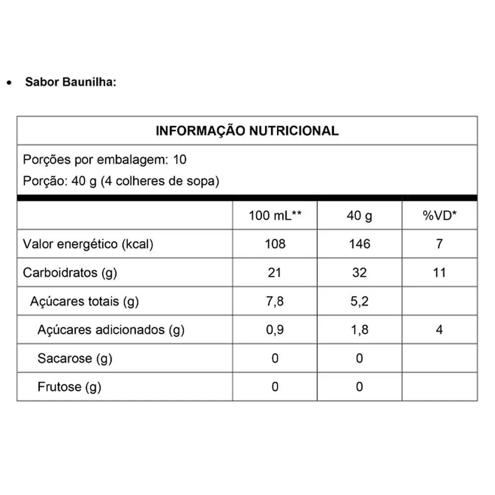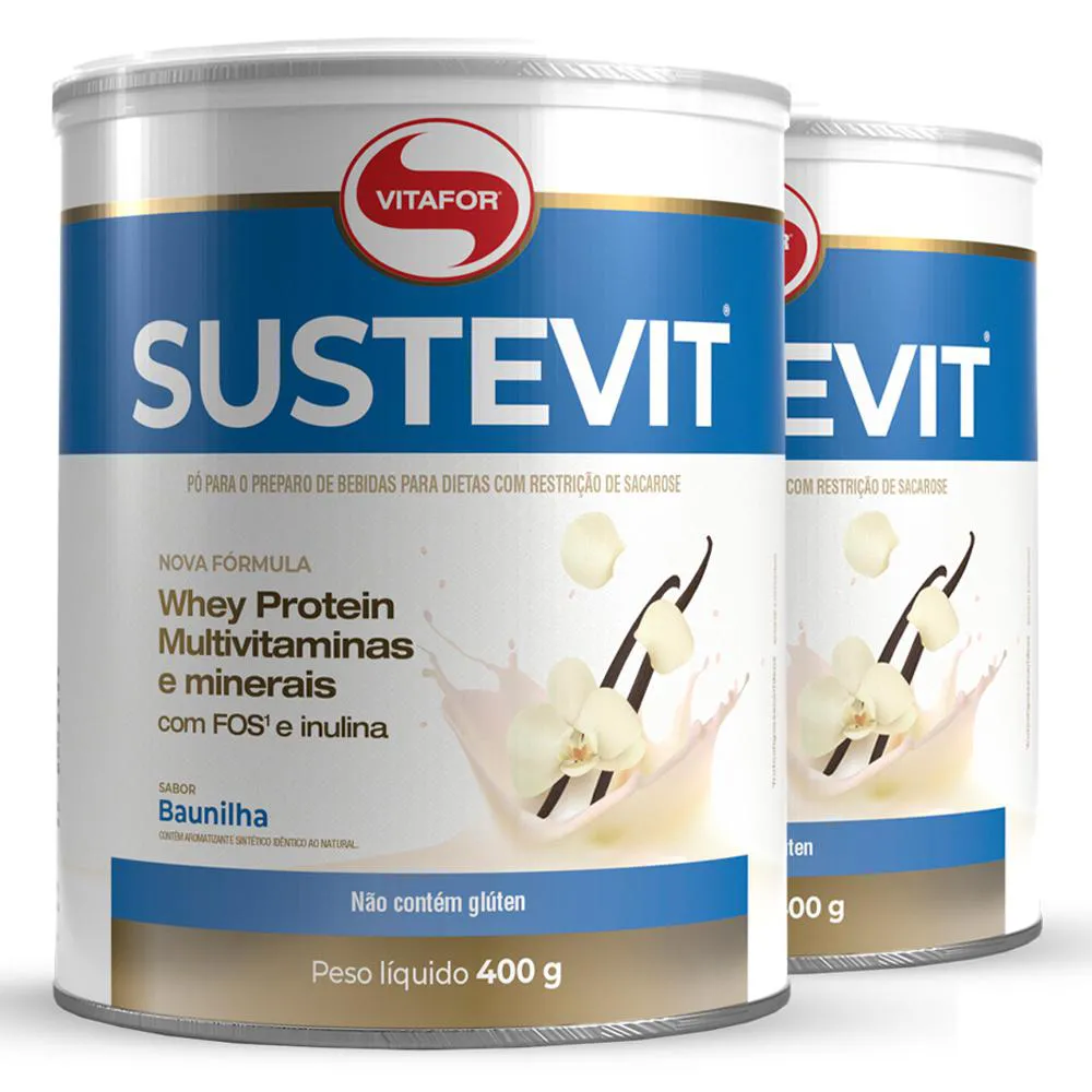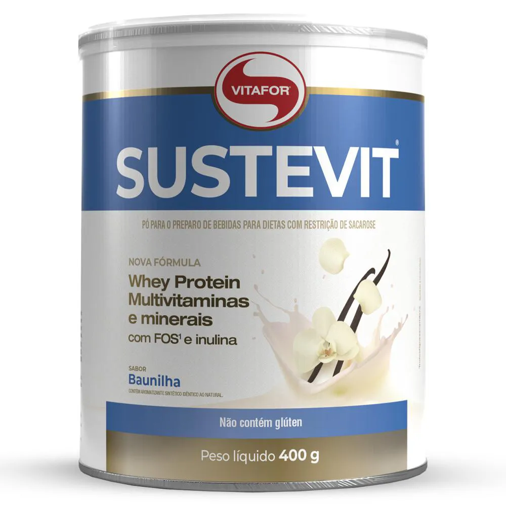 Sustevit - 400g baunilha - Vitafor Sobre o produto SUSTEVIT® é um complemento alimentar diário para quem busca garantir os nutrientes indispensáveis para uma rotina saudável. Com a combinação de whey protein, vitaminas, minerais e fibras que irão auxiliar na imunidade, saúde muscular, óssea e intestinal. É super prático e pode ser consumido quente ou frio. Benefícios Formulação completa Contém Whey Protein Concentrado proteínas de alto valor biológico Rico em fibras (Frutooligossacarideo- FOS e Inulina) 27 de vitaminas e minerais Zero gordura trans Modo de usar: Adicione 40g (4 colheres de sopa) em aproximadamente 200 mL (1 copo) de leite desnatado e misture até total homogeneização. Pode ser utilizado em todos os tipos de leites (leite desnatado, leite integral, leite sem lactose, etc) e bebidas vegetais. Para manter suas vitaminas não deve ser fervido. Ingredientes: Maltodextrina, proteína de soro do leite concentrado (Whey Protein Concentrate – WPC), frutooligossacarídeos (FOS), inulina, fosfato tricálcico (cálcio e fósforo), cloreto de potássio (potássio), bitartarato de colina (colina), sulfato de magnésio monoidratado (magnésio), inositol, ácido ascórbico (vitamina c), nicotinamida (vitamina B3)