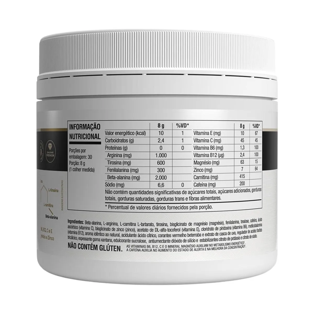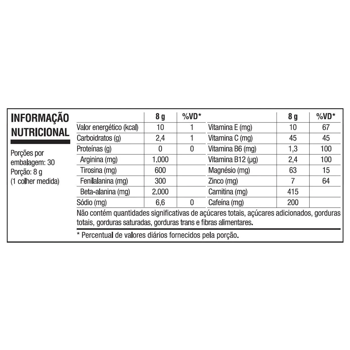 - Zero açúcar. Recomendação de uso: Suplemento alimentar de uso adulto (a partir de 19 anos de idade): consumir 45 mL do produto pronto para o consumo a cada 2 horas não ultrapassando a porção diária de 300 ml ou seguir a recomendação de um profissional da saúde. Modo de uso: Diluir 8,0 g (1 colher medida) do produto em 300 ml de água ou na sua bebida favorita, guardar em recipiente fechado e consumir 45 ml a cada 2 horas. Após preparado o produto, mantê-lo no recipiente bem fechado em temperatura ambiente ou sob refrigeração, se preferir. Ingredientes: Sabor Uva: Beta-alanina, L-arginina, L-carnitina L-tartarato, tirosina, bisglicinato de magnésio (magnésio), fenilalanina, trealose, cafeína, ácido ascórbico (vitamina c), bisglicinato de zinco (zinco), acetato de DLalfa-tocoferol (vitamina e), cloridrato de piridoxina (vitamina B6), metilcobalamina (vitamina B12), aroma idêntico ao natural, acidulante ácido cítrico, corantes vermelho beterraba e extrato de casca de uva, regulador de acidez fosfato tricálcico, espessante goma xantana, edulcorante sucralose, antiumectante dióxido de silício e estabilizantes citrato de potássio e citrato de sódio. NÃO CONTÉM GLÚTEN. Cuidados e conservação: - Manter o produto bem fechado e conservar ao abrigo de luz, calor, odor e umidade.