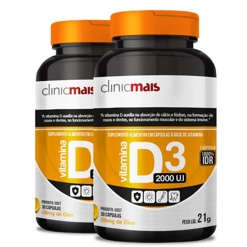Kit 2 Vitamina D3 2000 U.I 500mg ClinicMais 30 Cápsulas