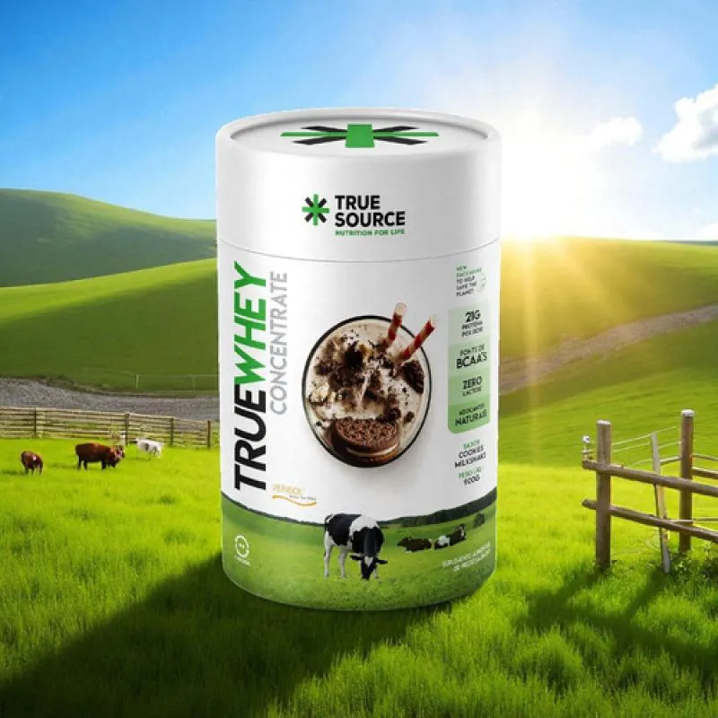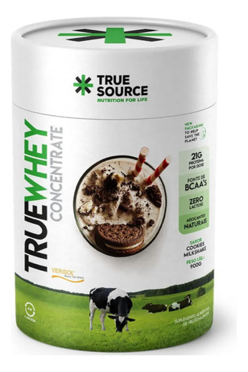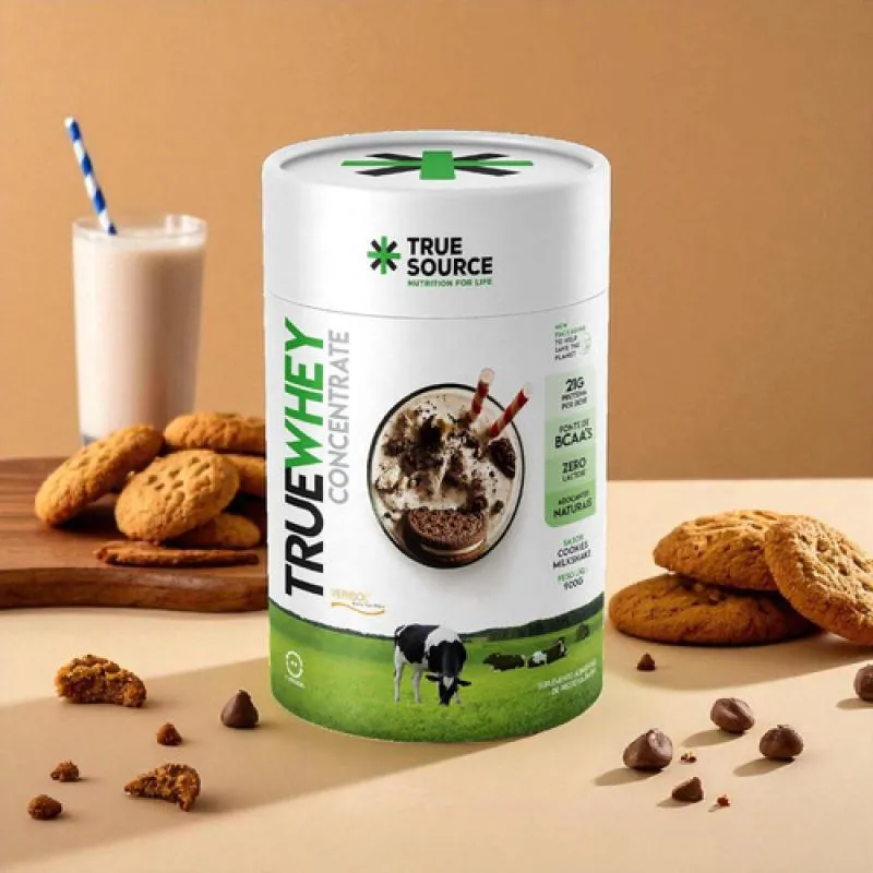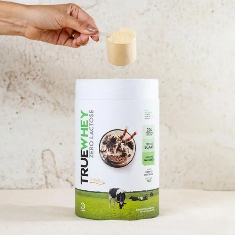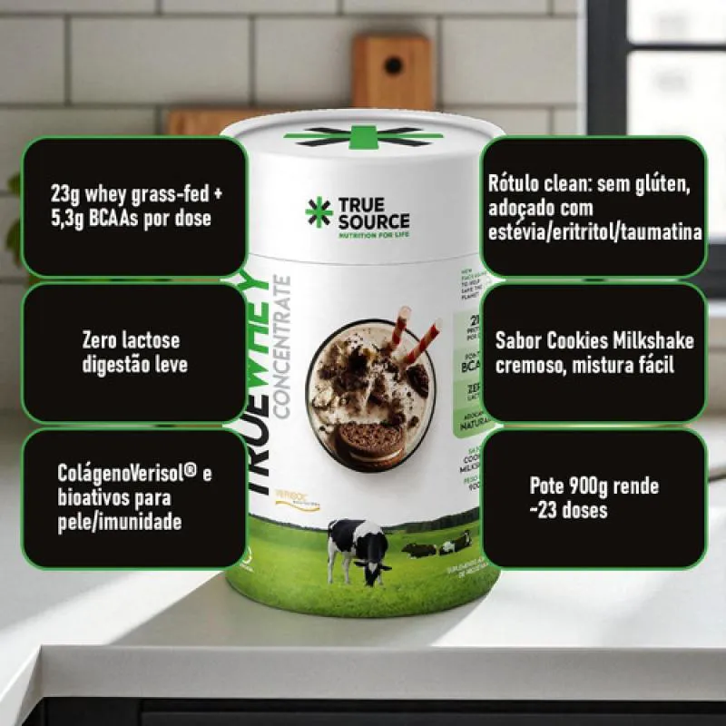 O True Whey Zero Lactose Cookies Milkshake da True Source é um suplemento proteico premium formulado para quem tem intolerância à lactose sem abrir mão de sabor e qualidade. Utiliza whey protein isolado e hidrolisado, livre de lactose, com rápida absorção e perfil completo de aminoácidos essenciais, incluindo BCAAs. Possui colágeno Verisol® e adoçantes naturais, oferecendo uma experiência rica, cremosa e leve.Composição