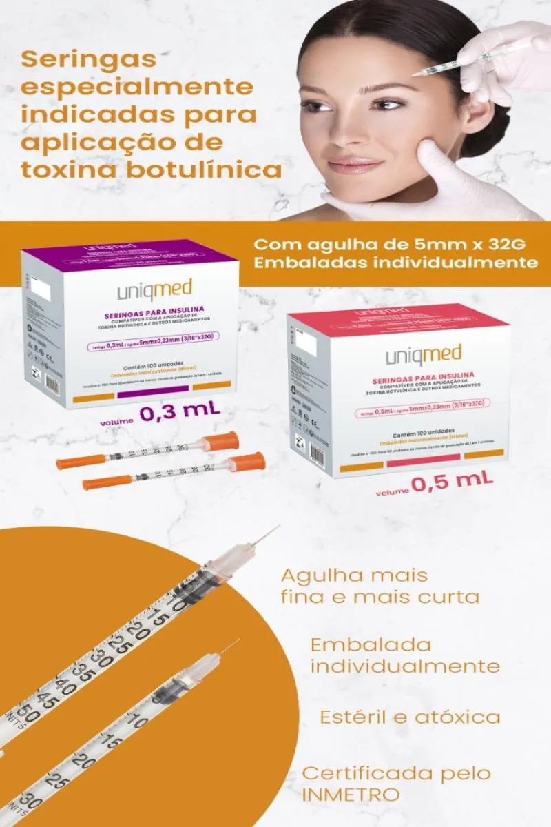 KIT 200UN SERINGA PARA INSULINA UNIQMED 0,3ML 8X0,30MM 31G Indicações: Indicada para aplicação de insulina e toxina botulínica. Proporciona menos dor e maior conforto. Características: