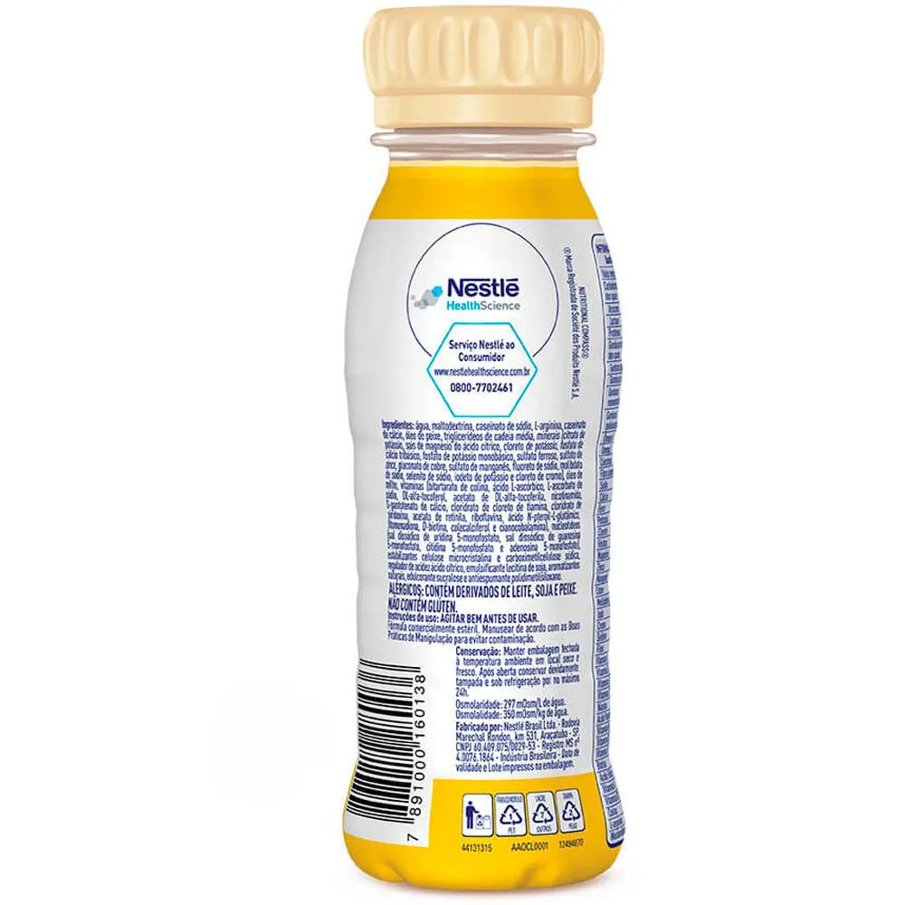 Água, maltodextrina, caseinato de sódio obtido do leite de vaca, óleo de peixe, L-arginina, caseinato de cálcio obtido do leite de vaca, triglicerídeos de cadeia média, óleo de milho, citrato de magnésio, cloreto de sódio, citrato de potássio, nucleotídeos, fosfato tricálcico, bitartarato de colina, vitamina c, fosfato de potássio, betacaroteno, vitamina e, sulfato de zinco, sulfato ferroso, niacinamida, vitamina a, pantotenato de cálcio, gluconato de cobre, sulfato de manganês, fluoreto de sódio, vitamina B1, vitamina B6, vitamina d, vitamina B2, vitamina K, cloreto de cromo, molibdato de sódio, ácido fólico, selenito de sódio, iodeto de potássio, biotina, vitamina B12, aromatizantes, regulador de acidez ácido cítrico, emulsificante lecitina de soja, edulcorante sucralose e antiespumante polidimetilsiloxano.