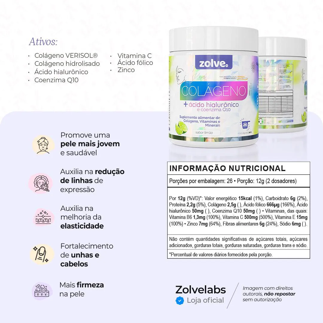 Zolve Skin Colágeno: Colágeno Verisol™, coenzima Q10, ácido hialurônico, colágeno hidrolisado, ácido fólico, zinco e vitamina C.