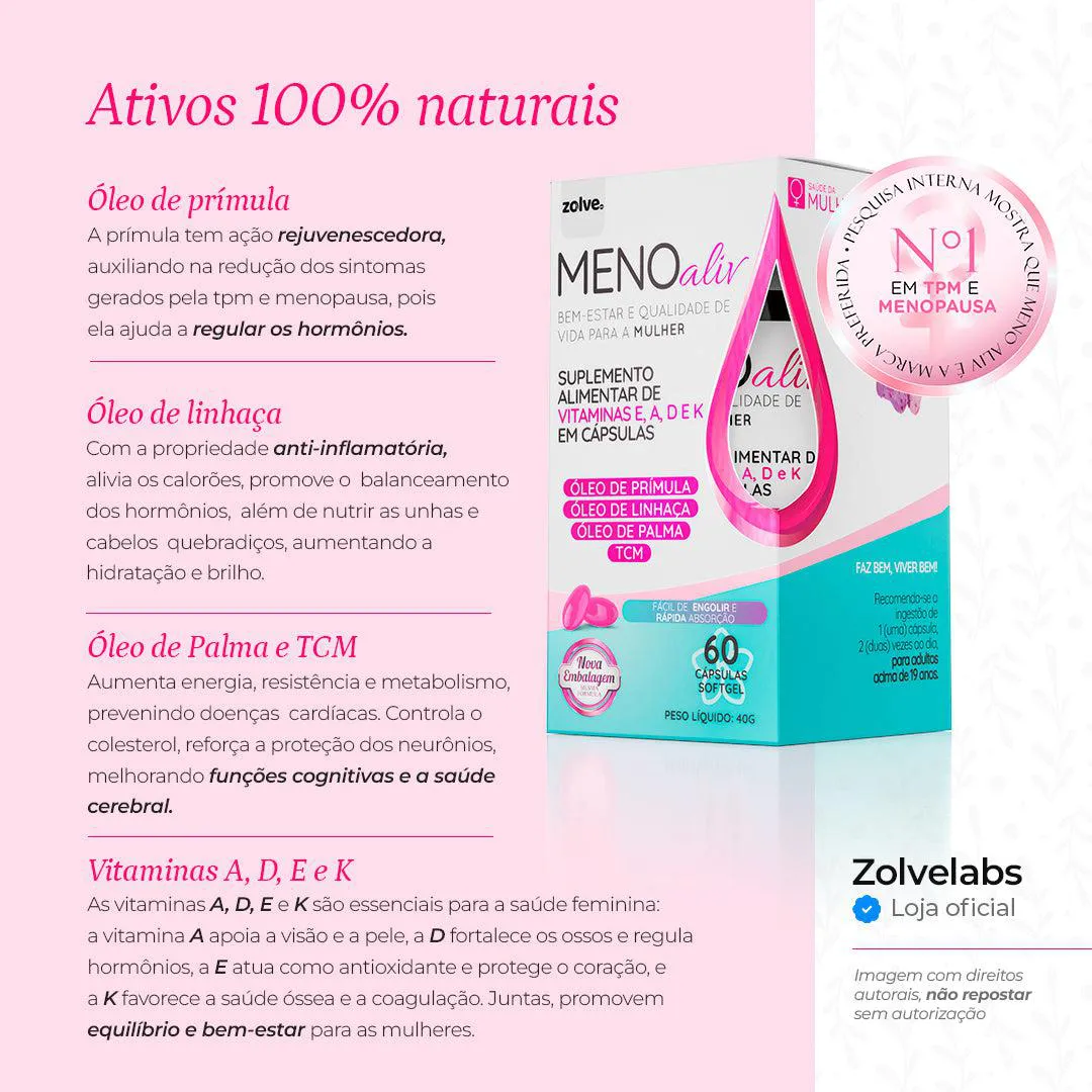 Meno Aliv® é um suplemento alimentar desenvolvido para mulheres que buscam bem-estar e vitalidade, com uma fórmula composta por ingredientes naturais e essenciais para o corpo. Com óleos e vitaminas importantes, é perfeito para complementar sua rotina.