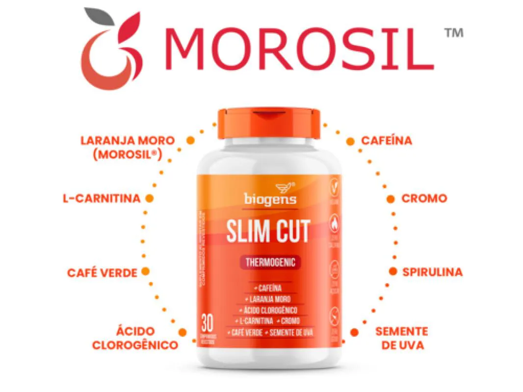 SLIM CUT TERMOGÊNICO 30 COMPRIMIDOS Morosil® é um extrato patenteado obtido a partir do suco das laranjas vermelhas Moro (Citrus sinensis (L.) Osbeck). Essa variedade de laranja é cultivada principalmente na área em torno do vulcão na Sicília, Itália. As laranjas Moro apresentam uma coloração vermelha intensa devido à presença de antocianinas, um tipo de flavonoide com propriedades antioxidantes. INGREDIENTES: Extrato de Laranja Moro (MOROSIL®), Extrato de Café Verde em pó, Cafeína Anidra, L-Carnitina, Extrato de Semente de Uva, Spirulina, Chlorella, Picolinato de Cromo. Estabilizante (Fosfato de Dicálcio – INS 341ii), Estabilizante (celulose microcristalina – INS 460i), Estabilizante (Polivinilpirrolidona- INS 1202), antiumectante (dióxido de silício – INS 551), lubrificante (estearato de magnésio - INS 470i) e Revestimento: Veículos (Álcool Etílico, Água Purificada e Polietilenoglicol). Estabilizante (Hidroxipropil- metilcelulose-INS 464) e Corantes (opacificante INS 171, Corante Vermelho 40 – INS 129). NÃO CONTÉM GLÚTEN SUGESTÃO DE USO: Adultos ≥ 19 anos, ingerir 1 (um) ou 2 (dois) comprimido(s) 30 minutos antes da principal refeição. ou conforme a orientação de médico ou nutricionista. CUIDADOS DE CONSERVAÇÃO: Conservar este produto bem fechado, em lugar fresco, seco e ao abrigo da luz. Após aberto consumir em até 30 dias.