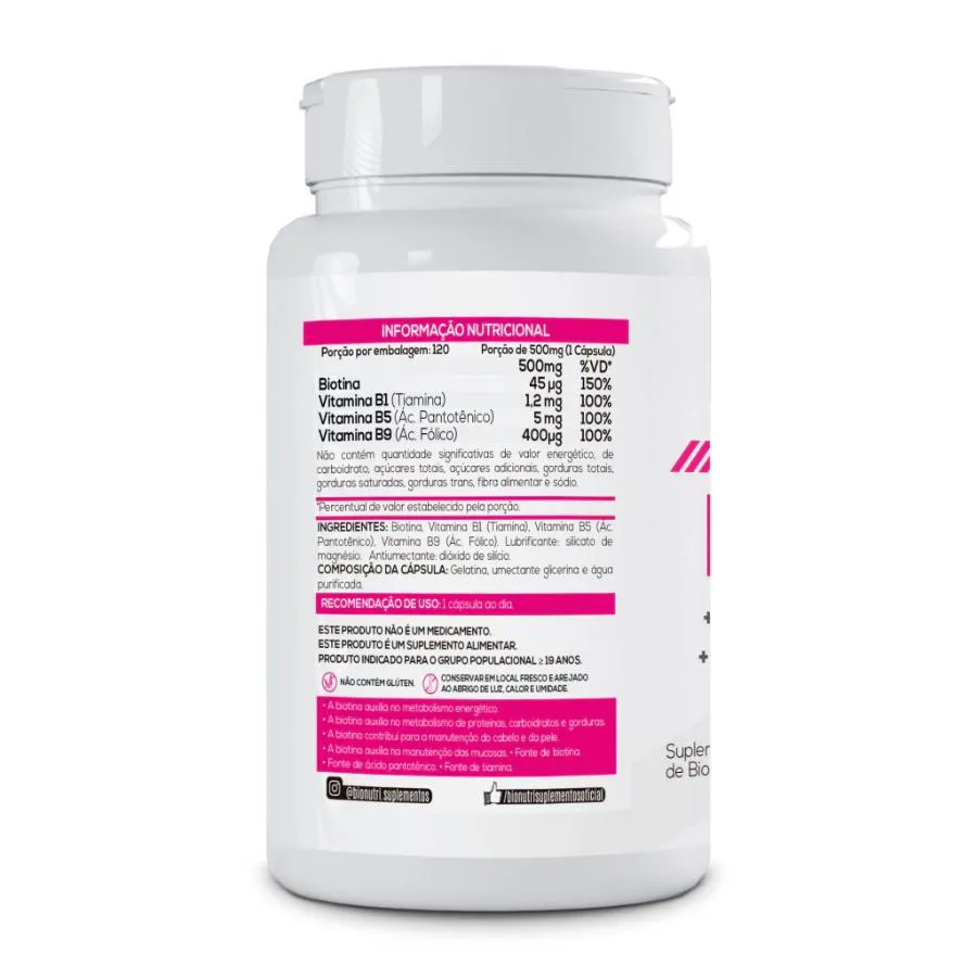 A Biotina Bionutri é um suplemento alimentar formulado para promover a saúde e o bem-estar de cabelo, pele e unhas. A biotina, também conhecida como vitamina B7 ou vitamina H, é uma vitamina essencial que desempenha um papel fundamental no metabolismo dos carboidratos, gorduras e proteínas, além de contribuir para a saúde geral do organismo. Principais benefícios e utilidades deste suplemento alimenta: Saúde Capilar; Unhas mais Fortes e Saudáveis; Pele Saudável; Melhora do Metabolismo; Fortalecimento do Sistema Nervoso; Suporte ao Crescimento Capilar; Combate à Deficiência de Biotina; Melhora na Energia e Bem-Estar.