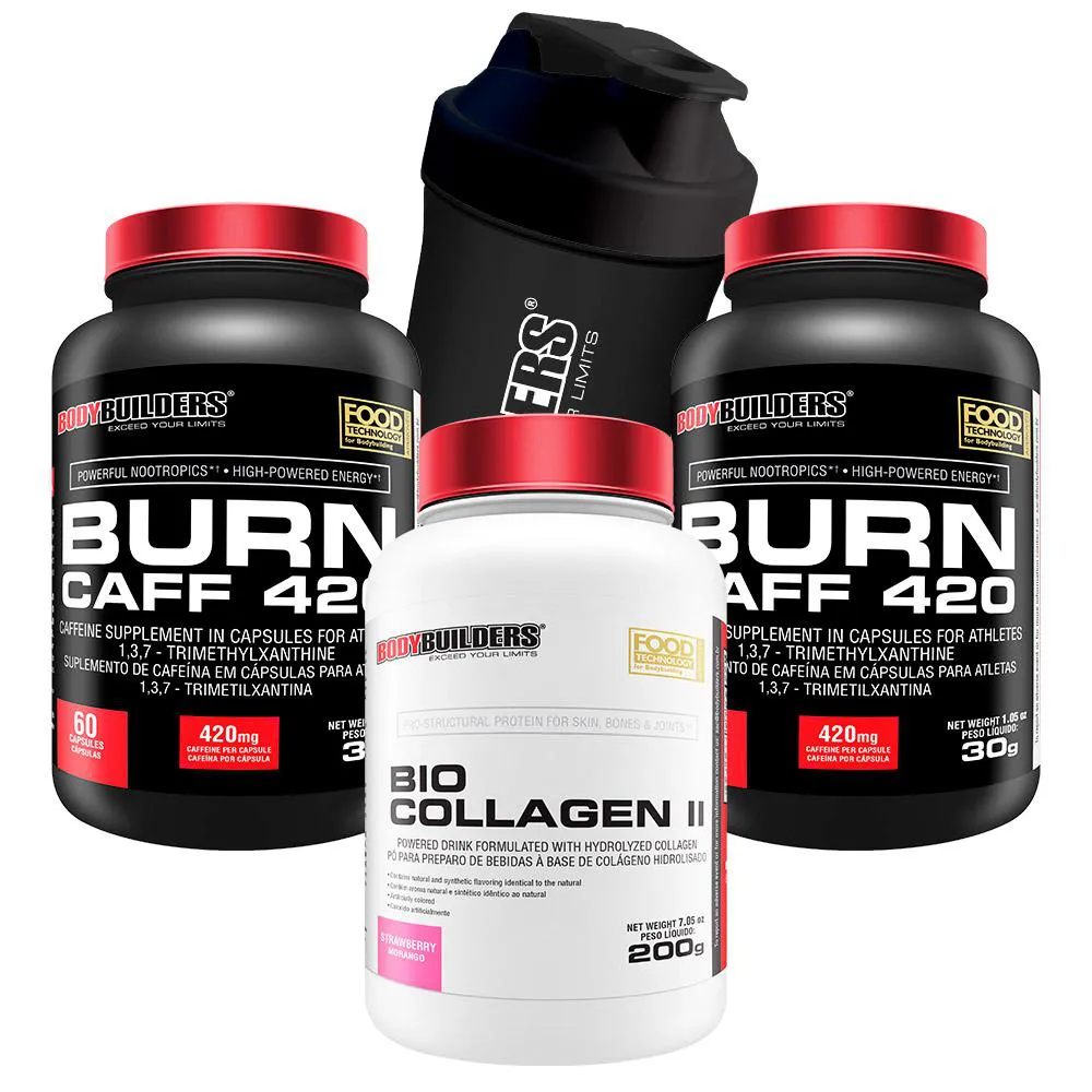 Kit Colágeno Bio Collagen II Bodybuilders 200g + Burn Caff Bodybuilders 420mg 60 cápsulas 2 unidades + Coqueteleira Bodybuilders